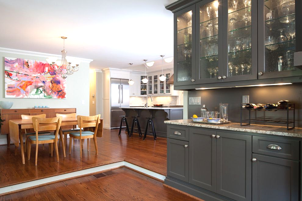 - между обоими представленными элементами часто имеется свободное пространство, в ходе чего верхняя шкафная поверхность может занимать место столешницы или специальной плоскости, для того чтобы появилась возможность выставить красивые предметы на обозрение гостей и хозяев.