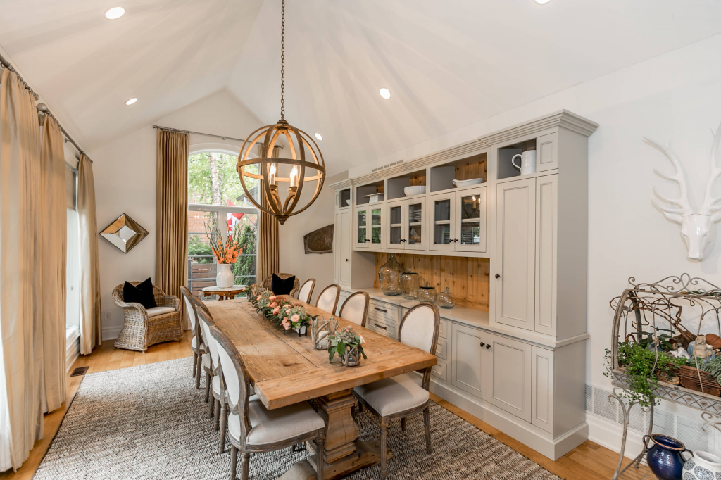 Столовая, оформленная во французском стиле, с большим буфетом в современном исполнении