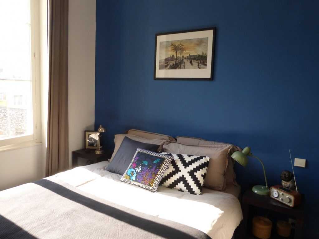 В спальне хорошо смотрятся холодные нежные оттенки в оформлении стен. Если же вы выбираете цвет темной глубины, повесьте на стену красивое большое зеркало . Индиго хорошо сочетается с зеркальными поверхностями.