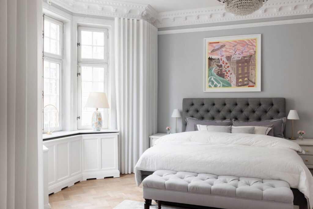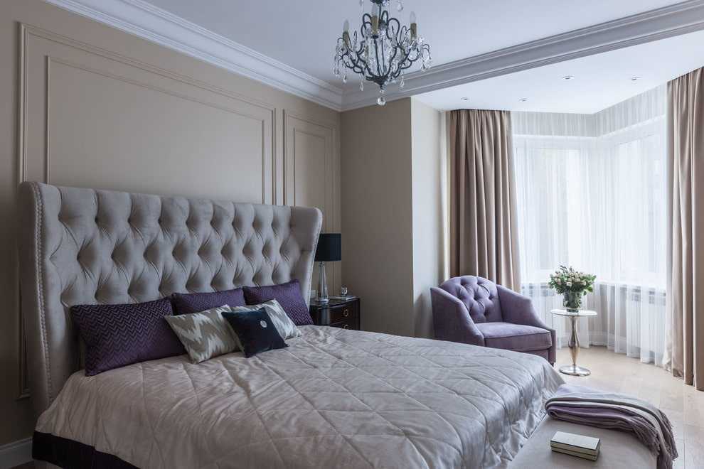 Эркер в спальне. Его можно превратить в маленький будуар, личное пространство для уединений — чтения книг, прослушивания музыки, общения в соцсетях. Здесь потребуется минимум мебели — на высокий поддонник будет достаточно положить несколько стильных мягких подушек (небольшой матрас или даже просто плед). Или вдоль окна установить скамью с нишами для хранения вещей. Вариант с креслами и журнальным столиком — достаточно спорный, только если вы собираетесь принимать в спальне очень близких, самых доверенных людей.