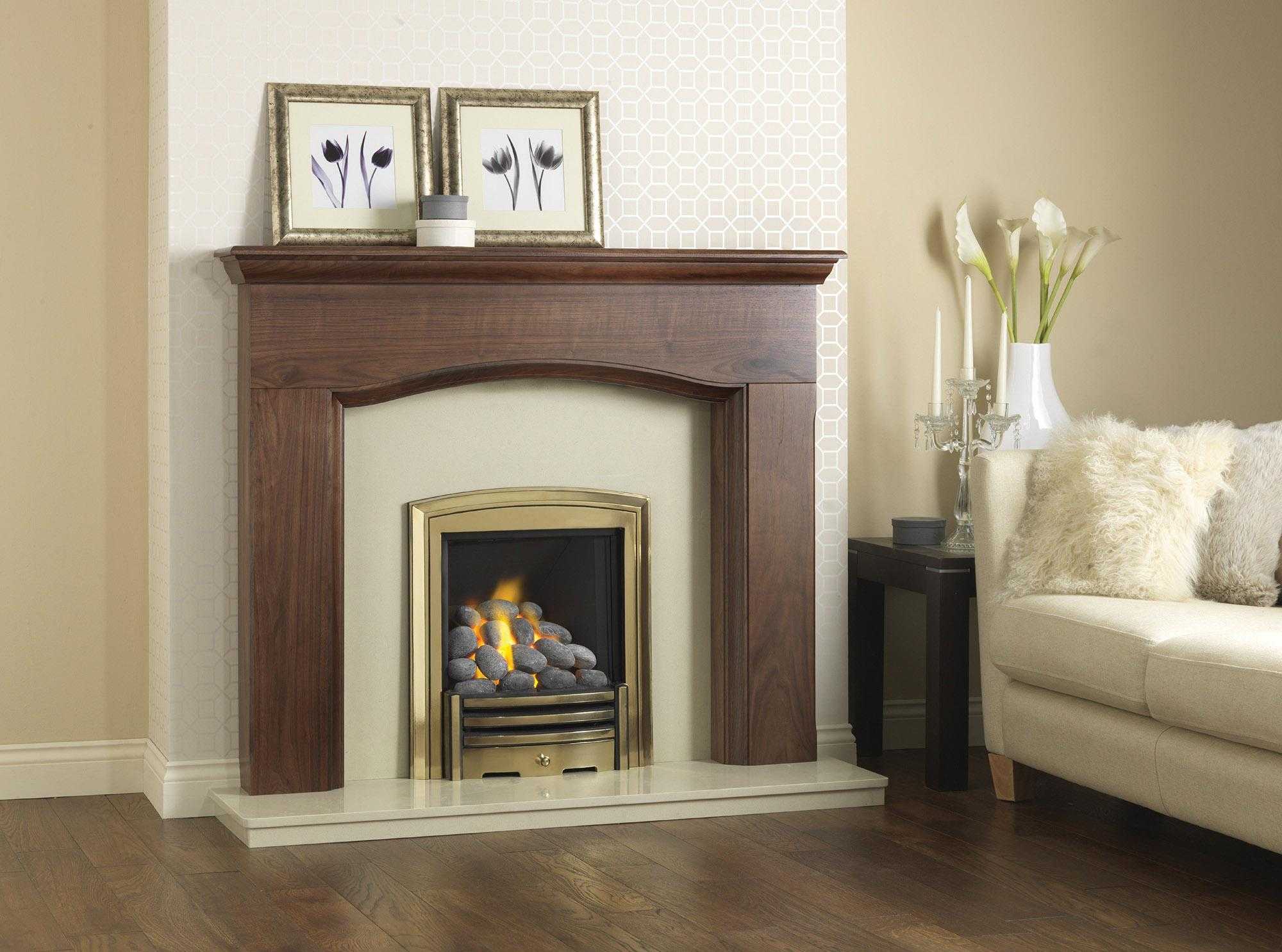 Коричневый паркет и обрамление камина с бежевыми обоями