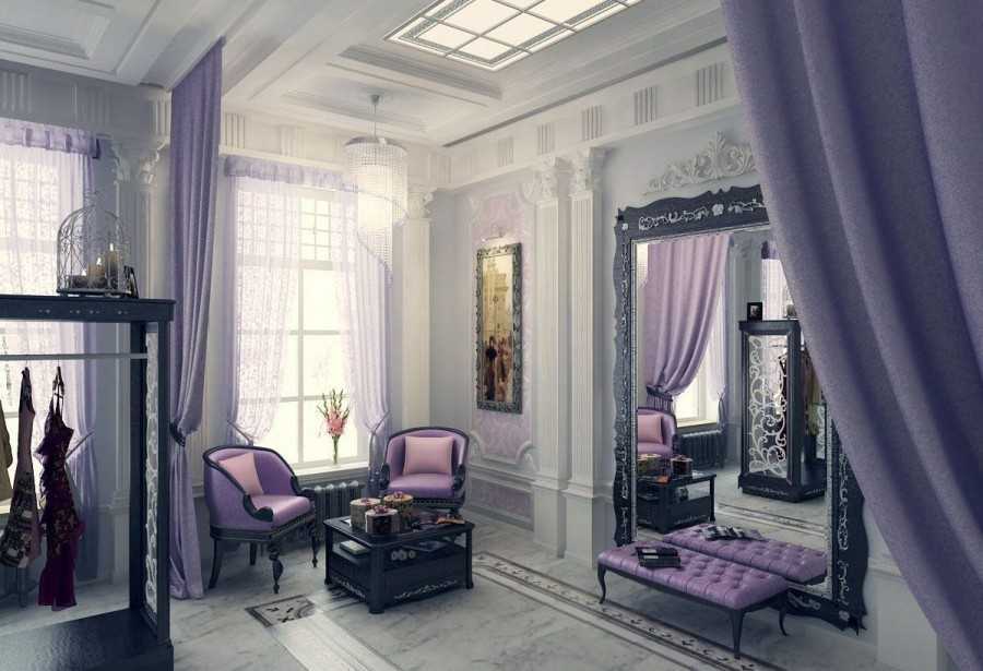 ВАЖНО: фиолетовые оттенки красиво смотрятся в качестве фона для светлой мебели, но в особенности для золота, серебра.