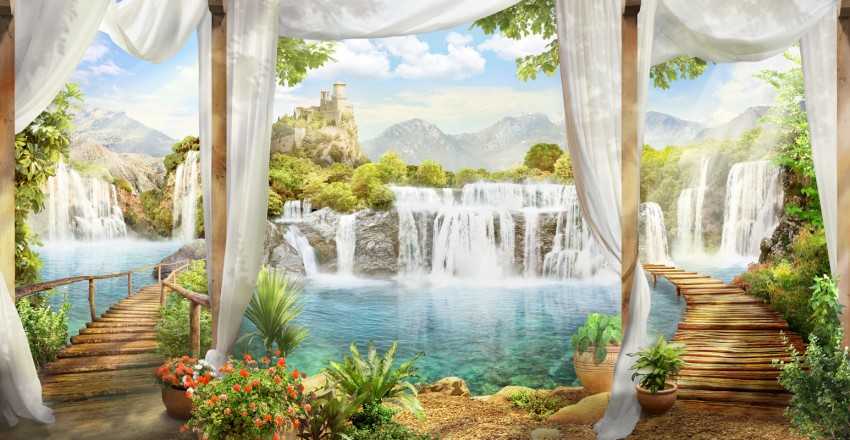- Пейзаж – здесь предоставляется безграничный простор для фантазии. Можно поместить изображение с уютным лугом, солнечным пляжем, дикой природой, скалами, лесами, парками. Особенно хорошо смотрится фреска в интерьере с фальш-окном, из которого открывается захватывающий вид.