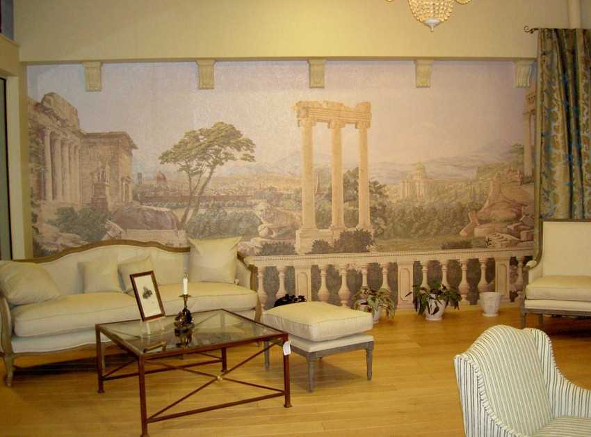 При выборе размера фрески и ее тематики нужно отталкиваться от размера помещения, расстановки мебели и стилевого решения.