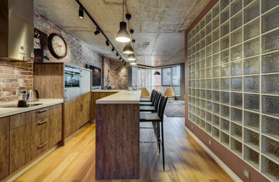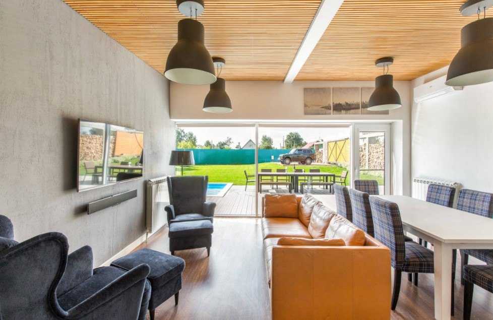 Они регулярно встречаются в гостиной, имеющей кухонную зону. Помимо этого, плафоны из стекла сочетаются с другими светильниками очень хорошо.