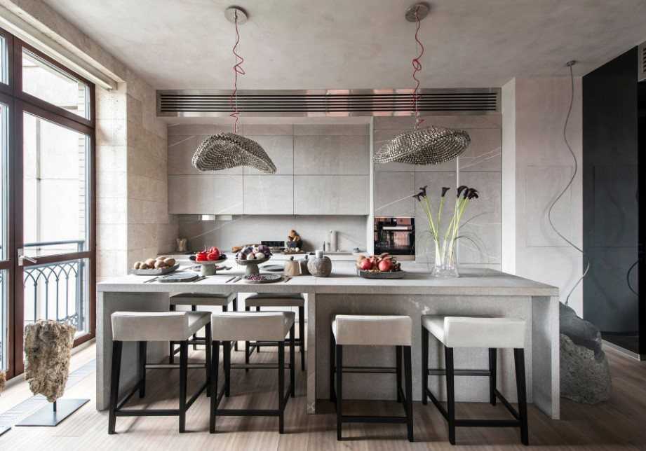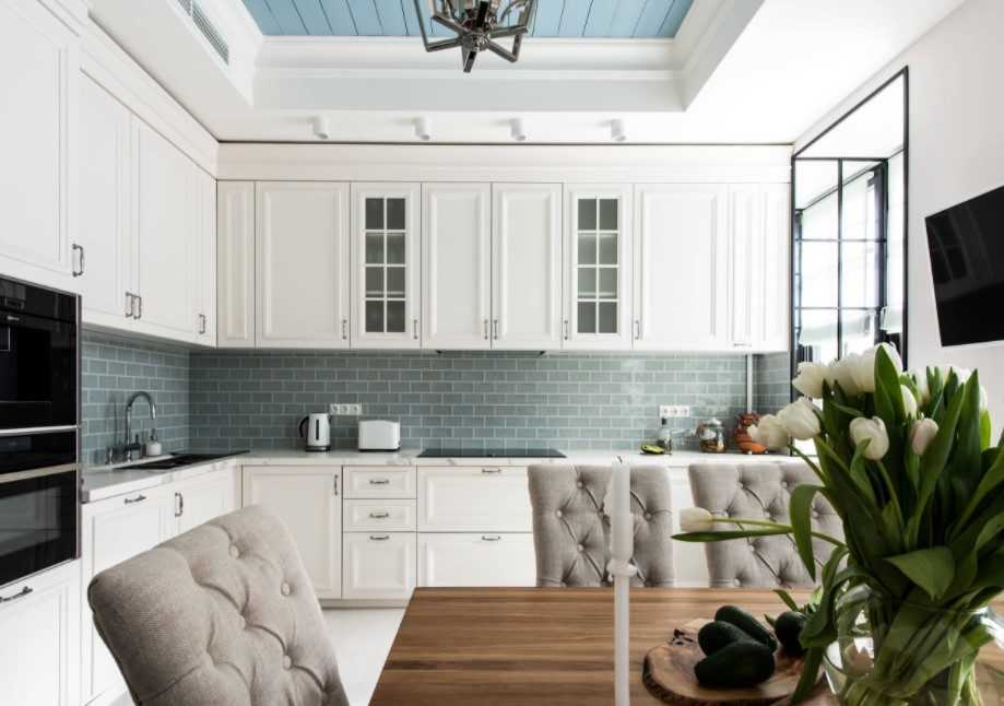 Оригинальный кухонный фартук с графическими орнаментами дополнит интерьер светлой кухни-студии