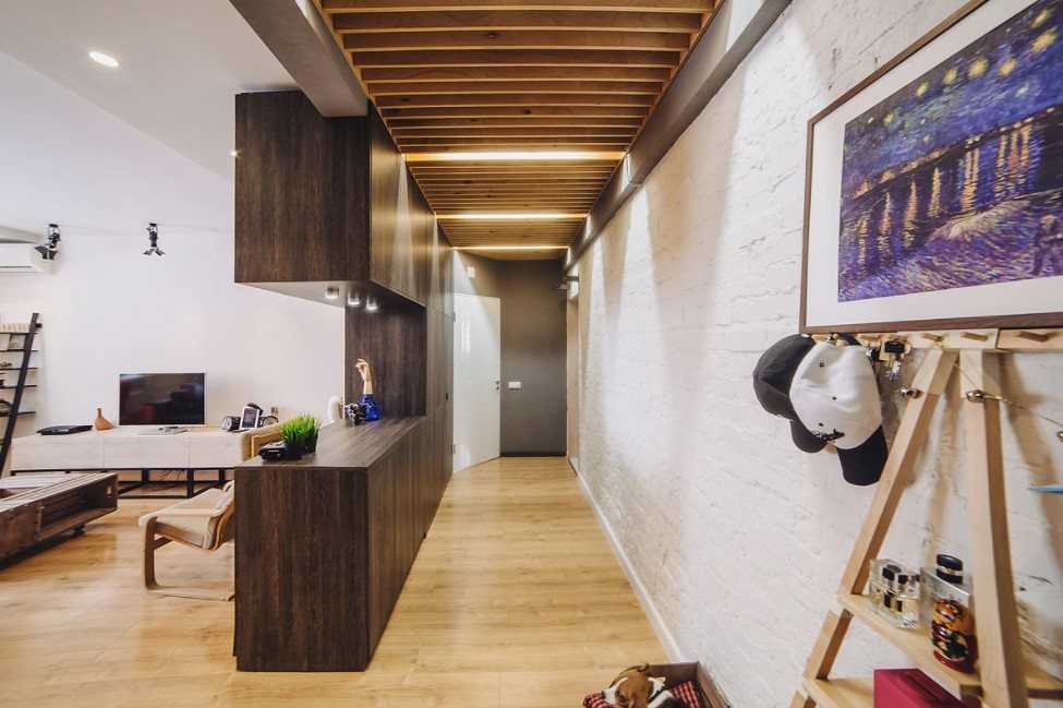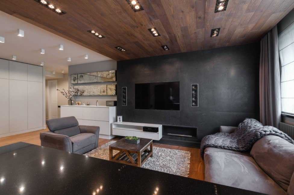 Комнаты с высокими стенами могут быть поделены на несколько уровней. При многоэтажности помещения эффектно смотрятся этажи, нависающие над гостиной. Зачастую в дополнение к ним ставят компактные лестницы светлых оттенков. В компиляции с данным подходом выгодно выглядят встроенные шкафы, которые не только создают эффект увеличения площади помещения, но и перспективно гармонируют с цветовой гаммой темных оттенков древесного цвета в созданном уровне.
