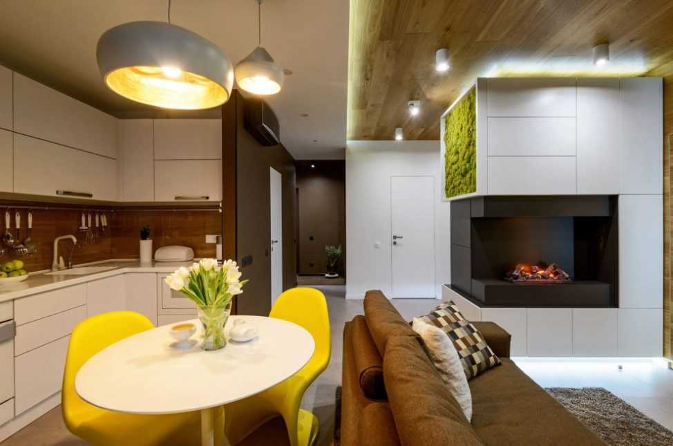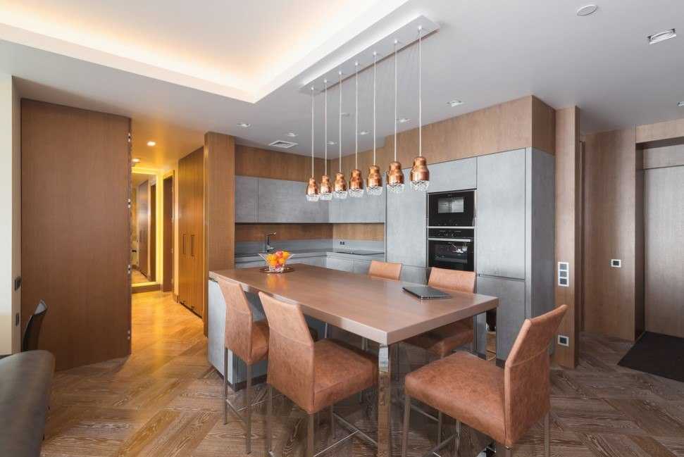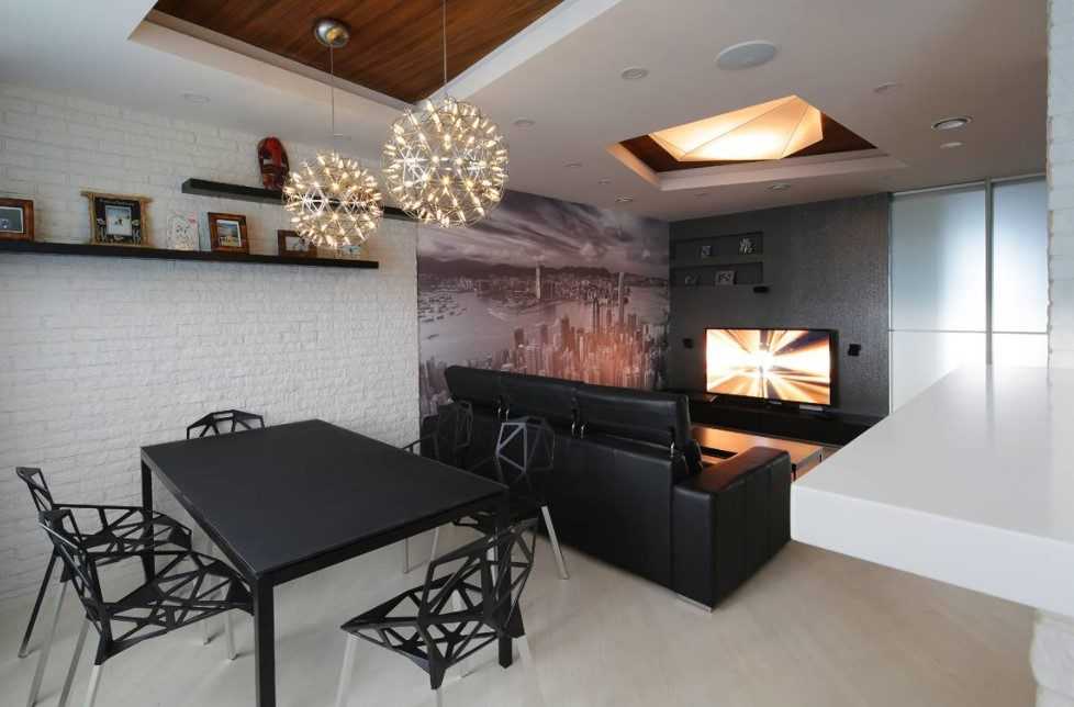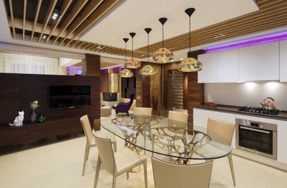 На меньшей территории желательно люстрой выделить исключительно одно место: столовое или развлекательное. Другое украсьте точечной разметкой, и ничего больше там не изменяйте. Излишнее количество света не поможет отдыху.