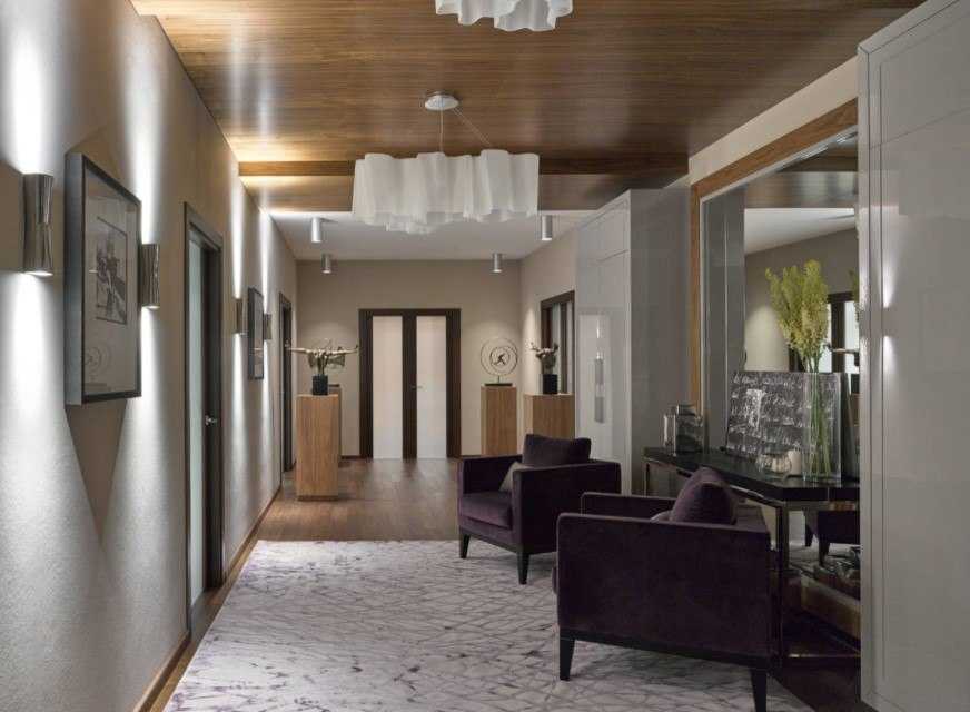 Тренд на минимализм обуславливает использование следующих приемовчистого интерьера»: минимум декора в отделке стен/ потолков/ полов(отсутствие плинтусов, молдингов, декоративных гипсовых розеток), минималистичные двери со скрытой коробкой(без филенок, узоров, стеклянных декоративных вставок, наличников), лаконичная фурнитура. Преимущественно прямые, простые линии(любые сложные формы стен/ потолков/ полов сейчас обуславливаются технической необходимостью, а не желанием создатьсложный/ интересный/ необычный дизайн).