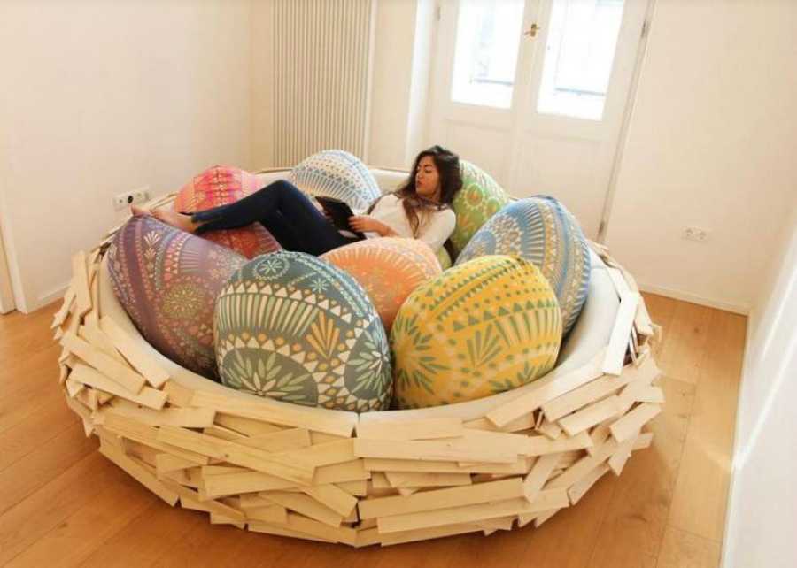 Уютное Гнездо Awesome Bird’s Nest — диван и уголок игр и отдыха детей — разработали дизайнеры студии O * GE CreativeGroup. Очень похоже на гнездо орла с гигантскими яйцами, не правда ли?