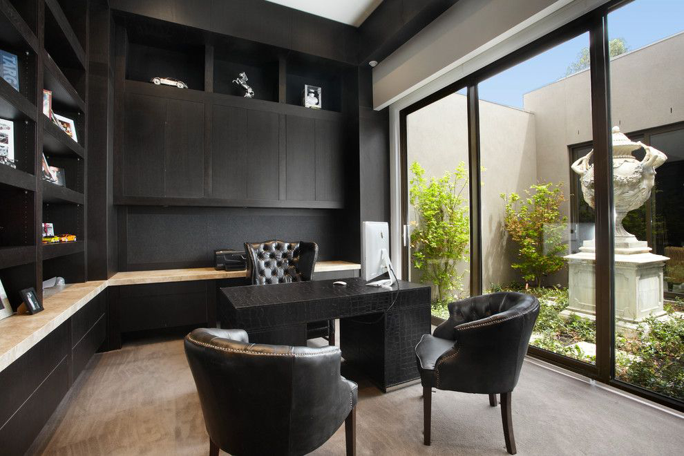 Обстановка кабинета не должна «давить». Создать располагающую атмосферу помогут кремовые и желтые краски в декоре. Такой фон просто требует мебели черных или белых тонов. В итоге получится очень эффектный интерьер.