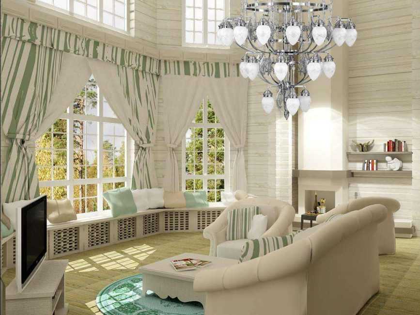 Гламурная обстановка в гостиной дачного домика привлечет кого угодно. Цветочный стиль мебели и штор характеризуют летний сезон. В такой комнате приятно находиться, отдыхать, проводить дружеские беседы.