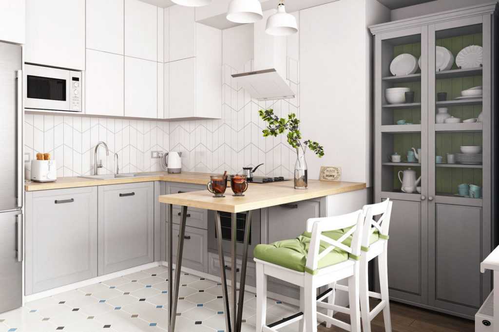 Небольшое пространство можно оптимально использовать в дизайне кухни, если оформить его в белом цвете. В комнате можно разместить все необходимое оборудование и много места для хранения. Чтобы оптически увеличить интерьер кухни 6 кв. м, стены можно покрыть белой краской и блестящими плитками-кабанчик. Дополните интерьер вкраплениями ненавязчивого серого.