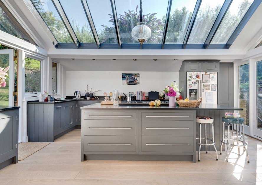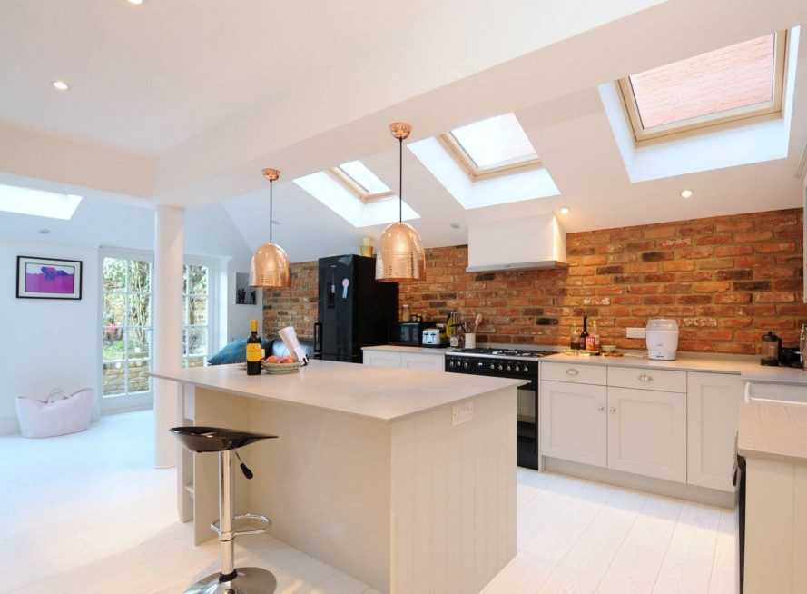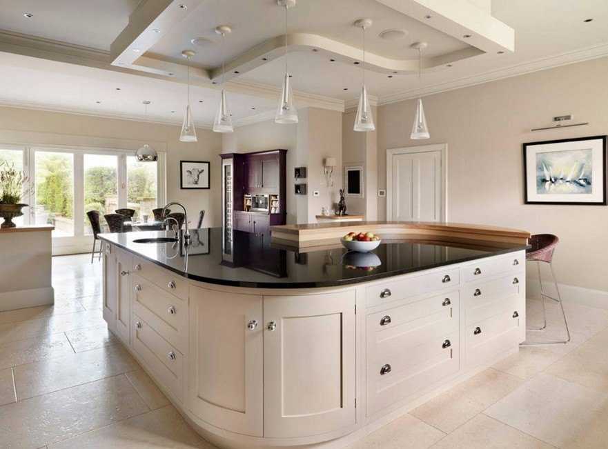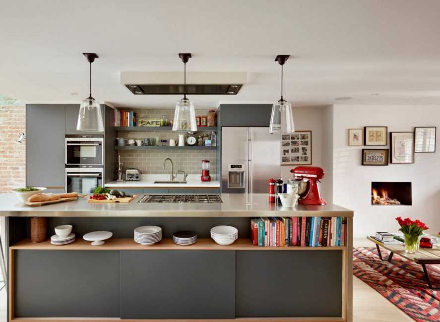 При обустройстве кухни, совмещенной со столовой, можно перенести в комод часть посуды или реже используемых аксессуаров и ограничить количество шкафов. Интересным решением являются кухонные планировки, полностью лишенные верхних шкафов — такой интерьер выглядит легким и современным.