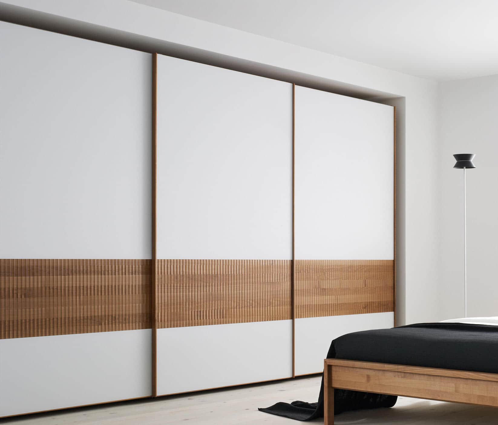 Шкаф-купе с большими пустыми дверьми, окрашенными в серый цвет, прекрасно впишется в интерьер в скандинавском стиле.