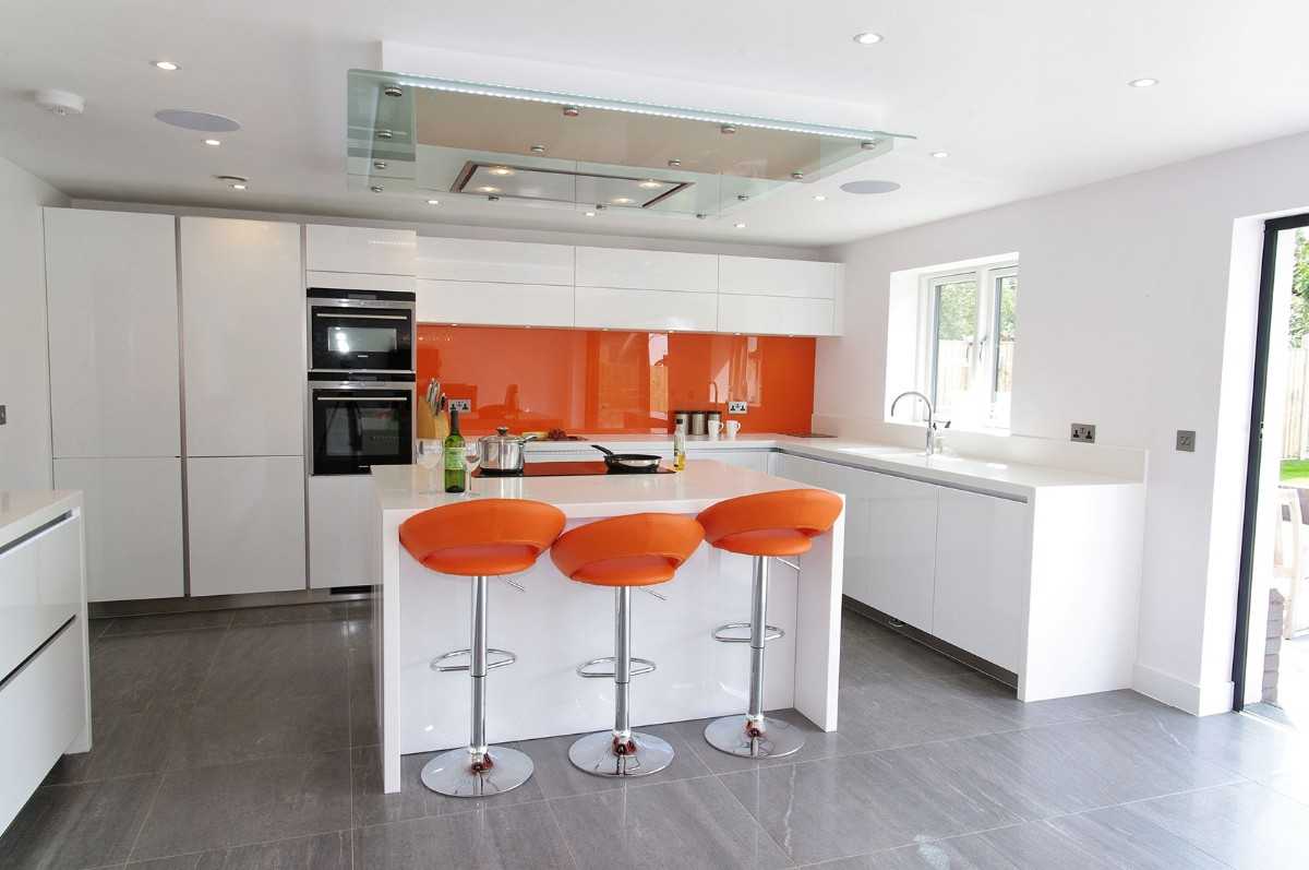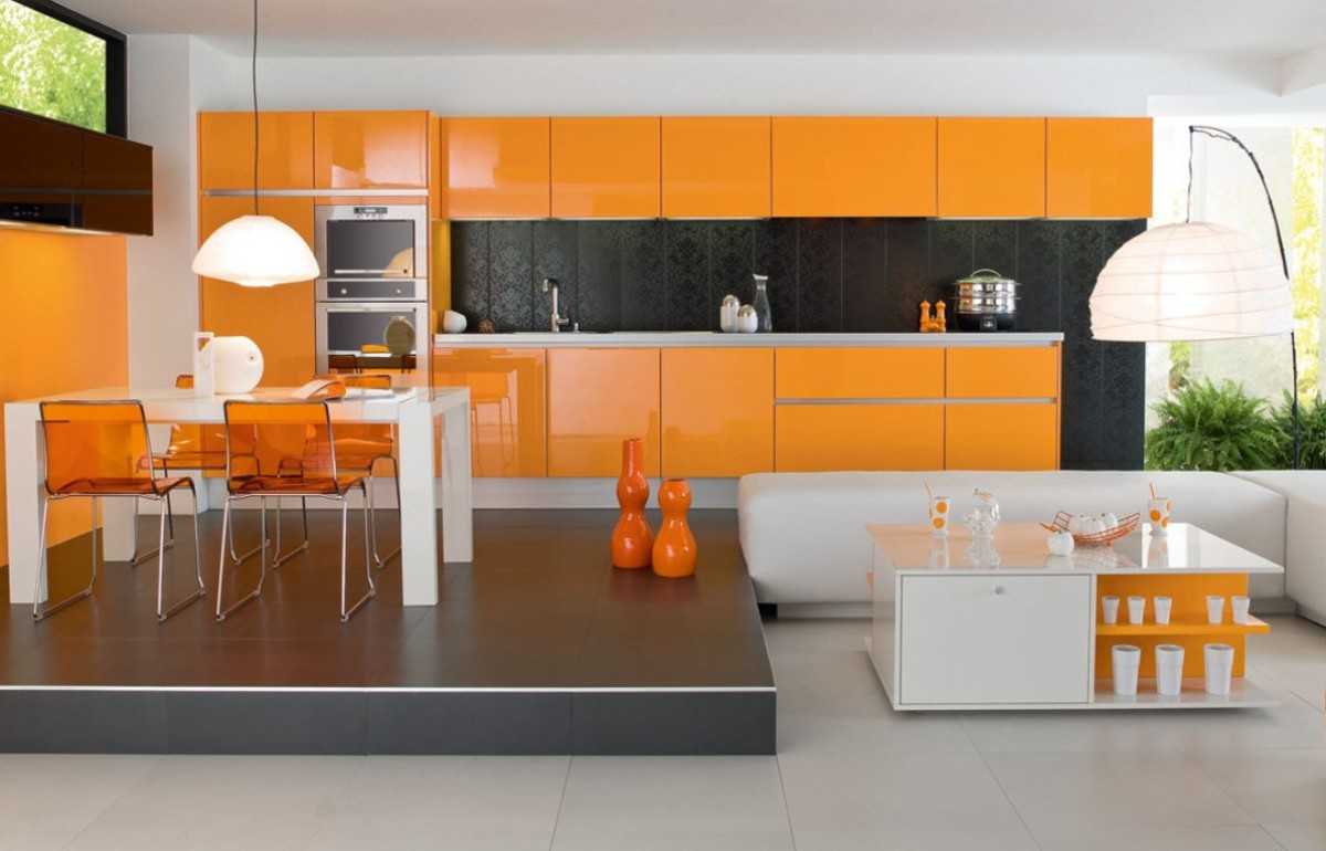 Ярко-оранжевые акценты в интерьере белой кухни (с фото)