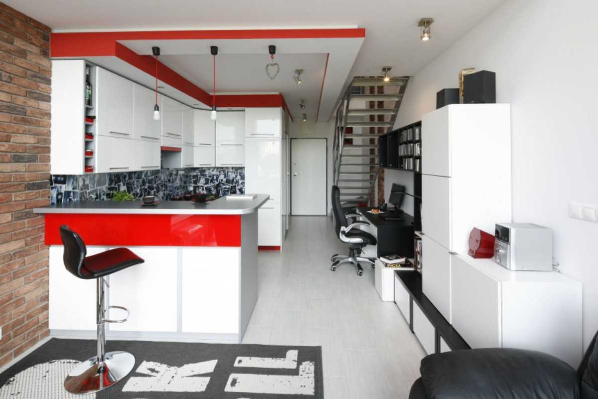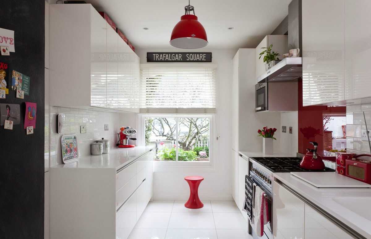 Красный в качестве ярких акцентов в дизайне белой кухни
