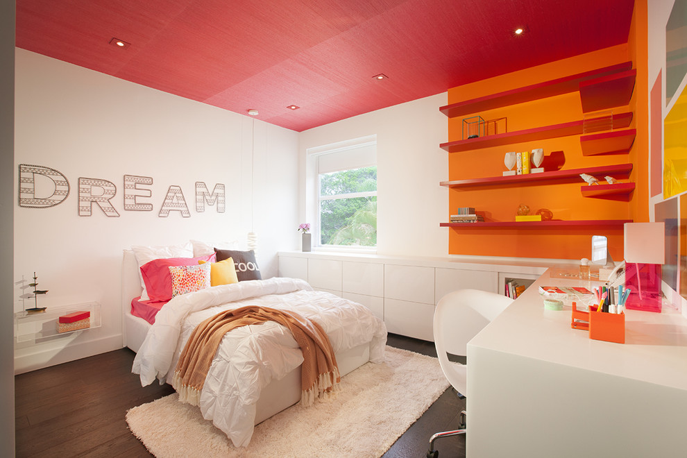 Господствующий серый цвет в этом следующем пространстве – спальня, разработанная Jeannie Balsam. Минимальное использование рекомендуемого цвета, гарантирует, что каждая часть кораллового цвета, действительно, учитывается.