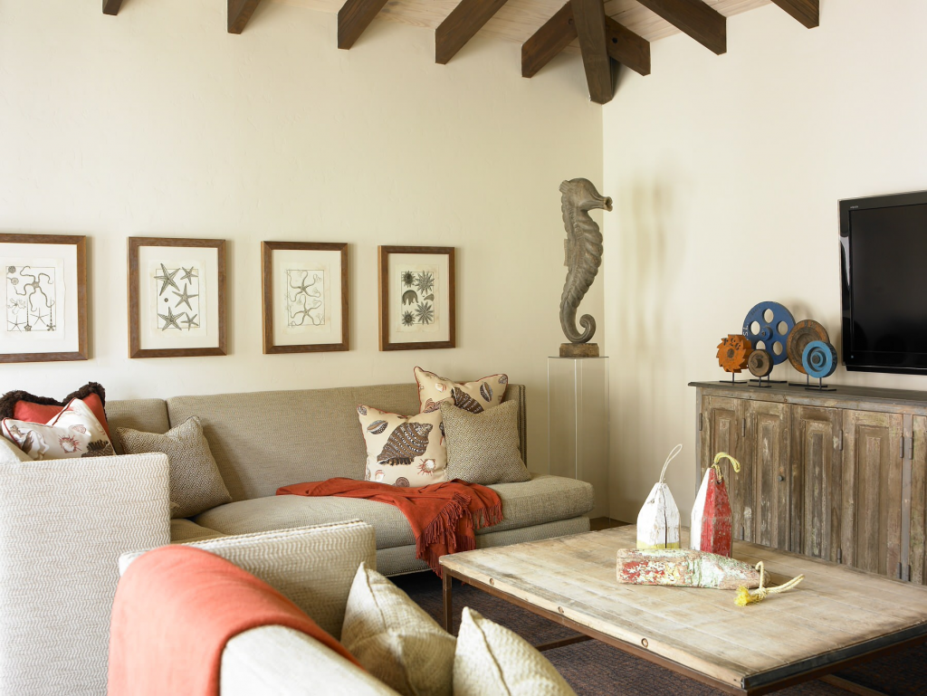 Вместо ярко-белого, комната ниже, использует кремовый оттенок, чтобы смягчить комбинацию кораллового и серого цвета. В то время как многие комнаты показывают галечные акценты, как морские ракушки, и похожи на гавань в океане. И эти современные мотивы идеально подходят для пространства.