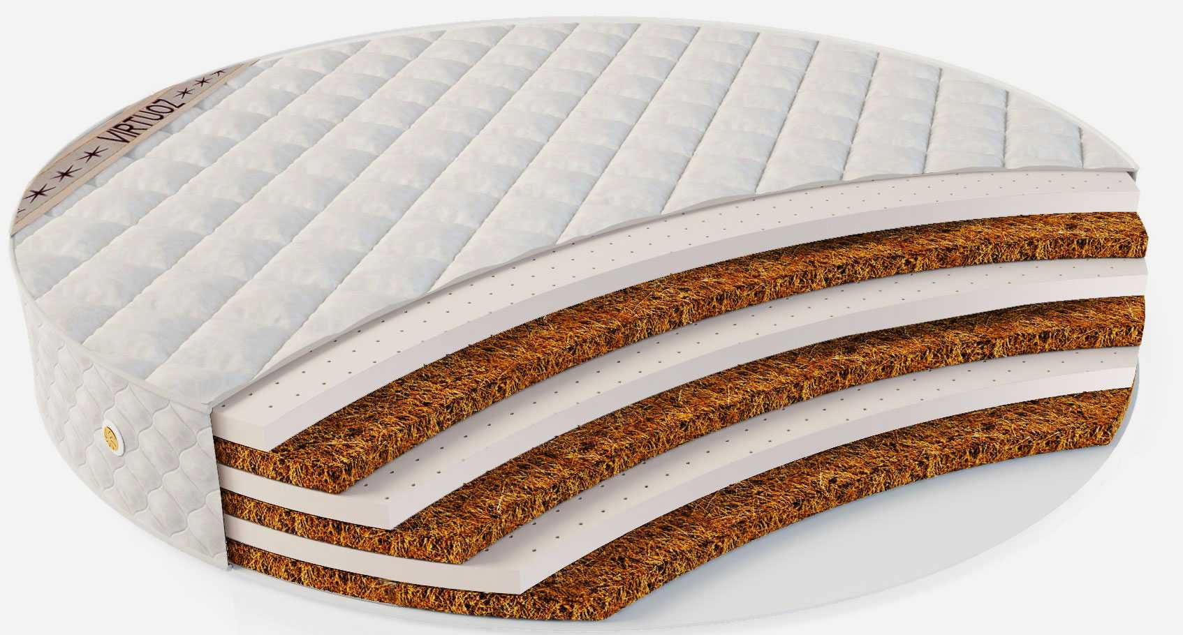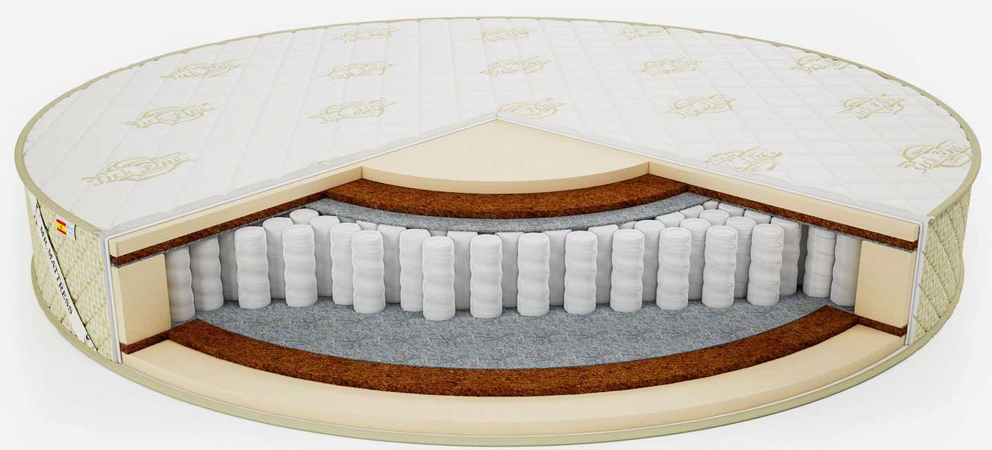 Обычно каркас такой модели изготовлен из металла и обшит фанерой, в качестве наполнителя дивана используется высококачественный латекс. Для большего комфорта спальное место покрыто защитным чехлом. Размеры круглой кровати обычно составляют от 2 до 2,5 м в диаметре.