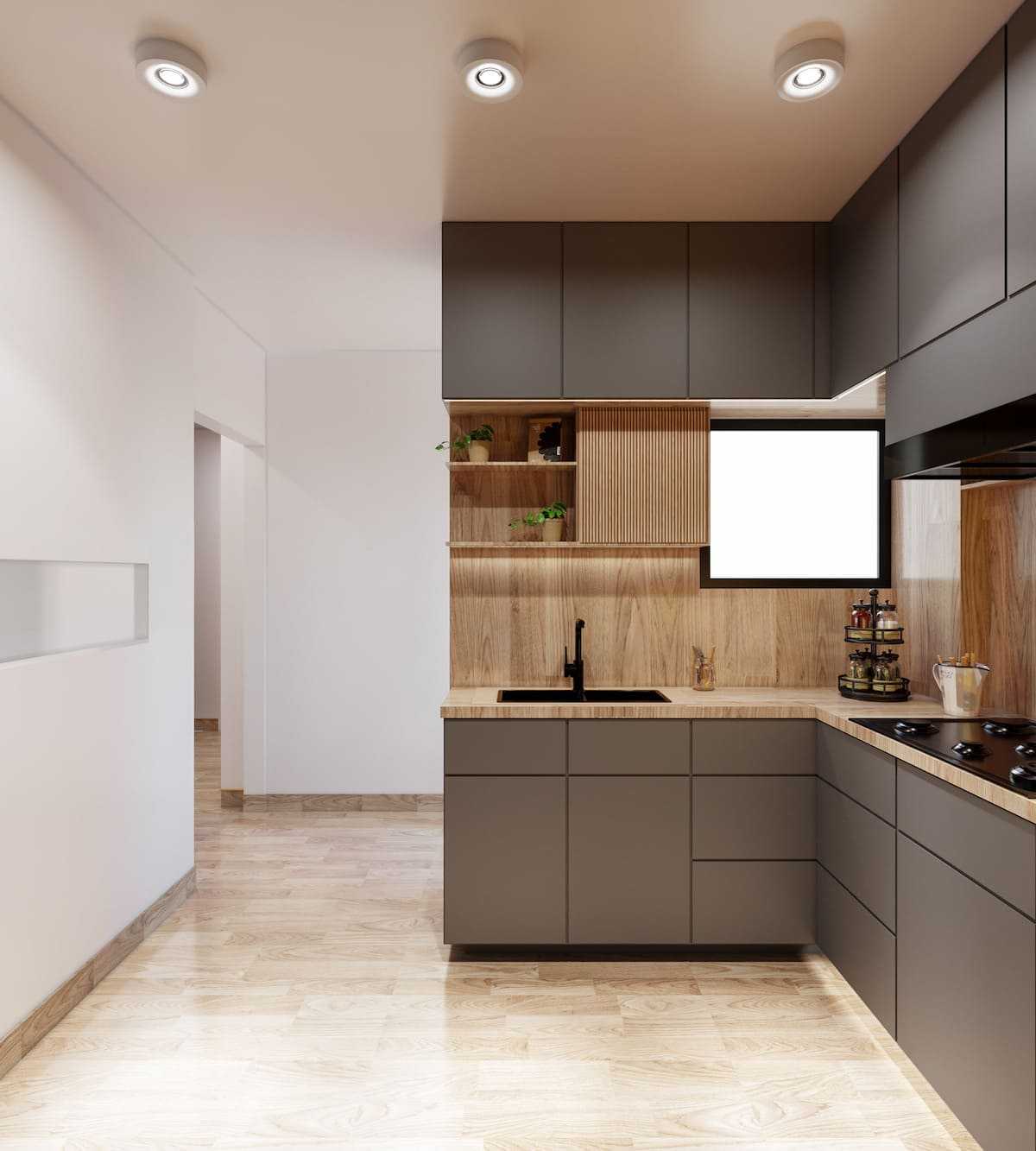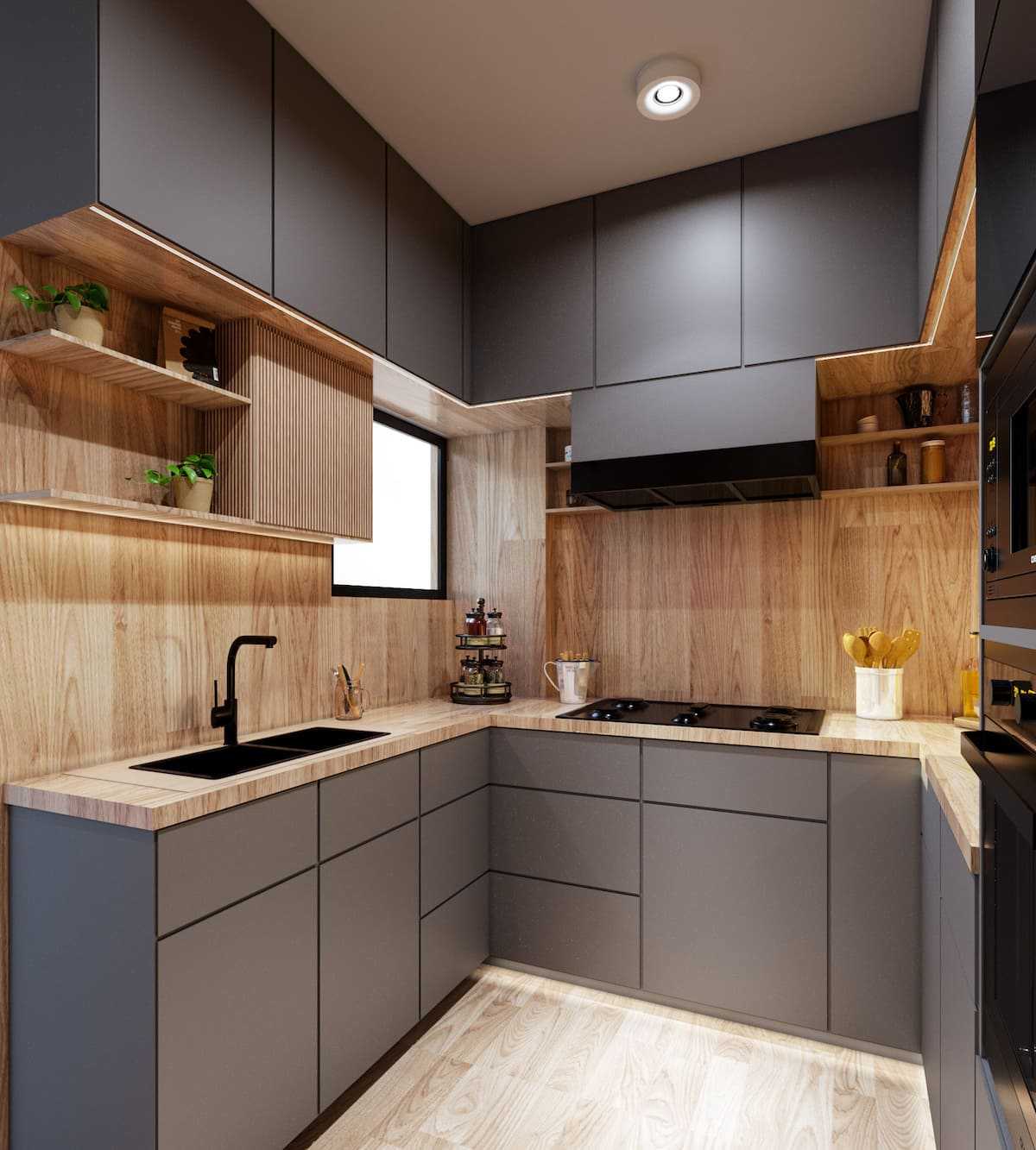 Темно-серая плитка на полу с таким же оттенком столешницы и штор дополняется фасадом из необработанного дерева. Стены, выложенные кирпичом, эффектно вписываются в интерьер и уравновешивают общий вид.
