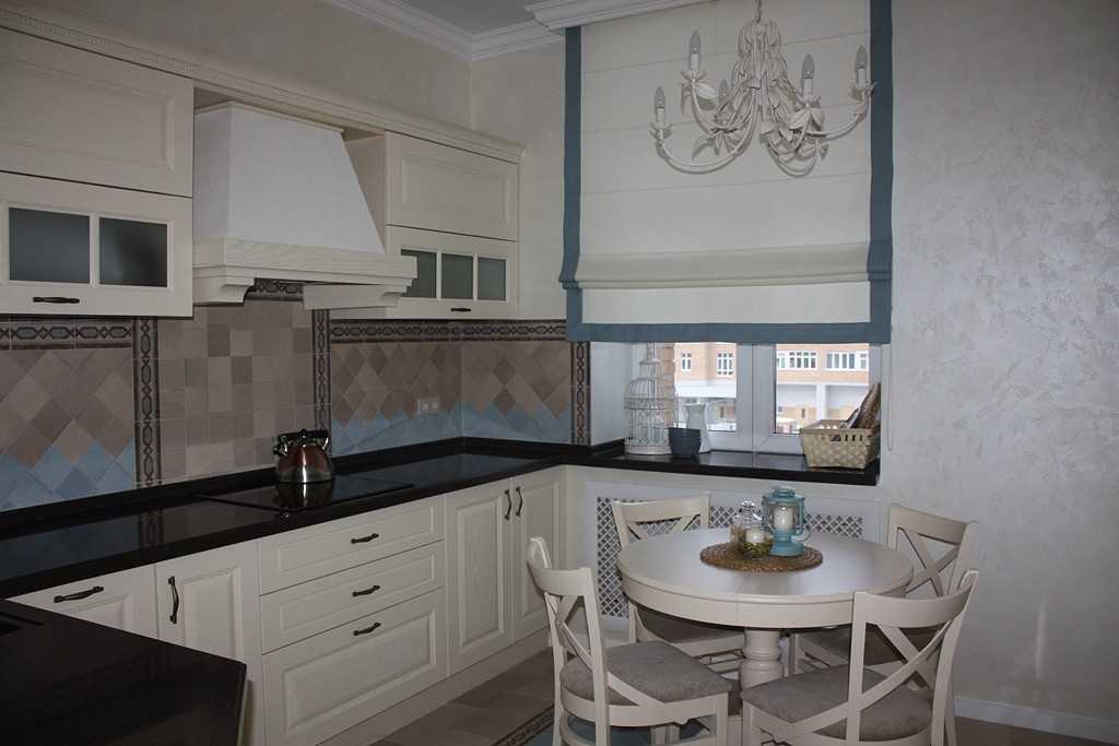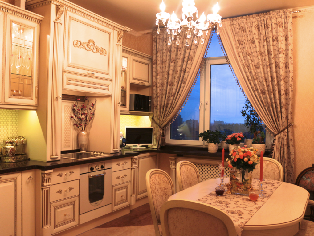 Шторы для окон и текстиль лучше выбирать в тон напольного покрытия или с двухцветным принтом, сочетающим комбинацию оттенков пола и стен. На карнизе также может располагаться рисунок. В качестве декора на фоне светлых стен и мебельных фасадов допускается располагать темные элементы в виде ваз, сервизов, картин. Но их не должно быть слишком много, иначе кухня станет мрачной. Оживить интерьер помогут подходящие по стилю яркие детали. Главное, не переусердствовать и не перегрузить ими пространство.