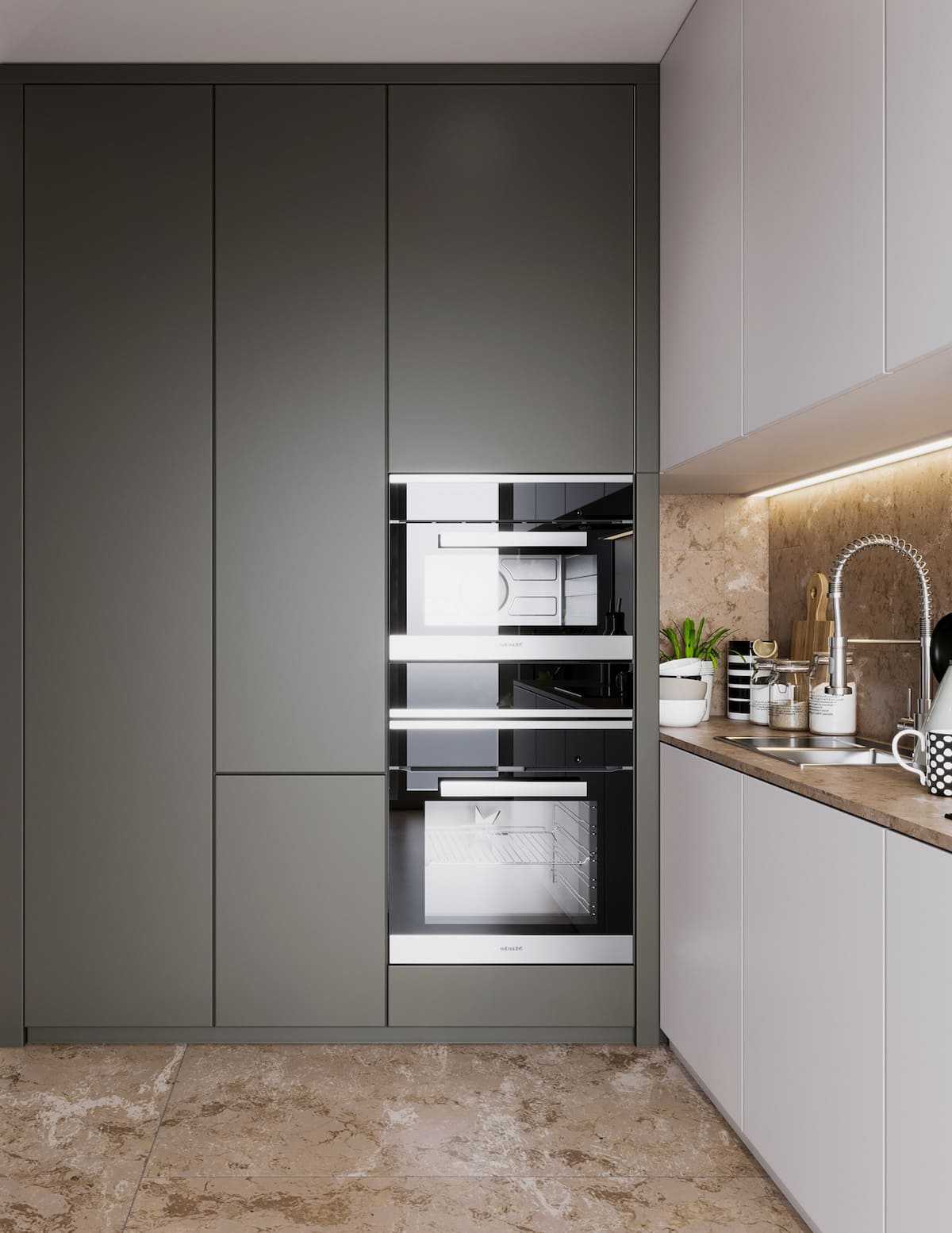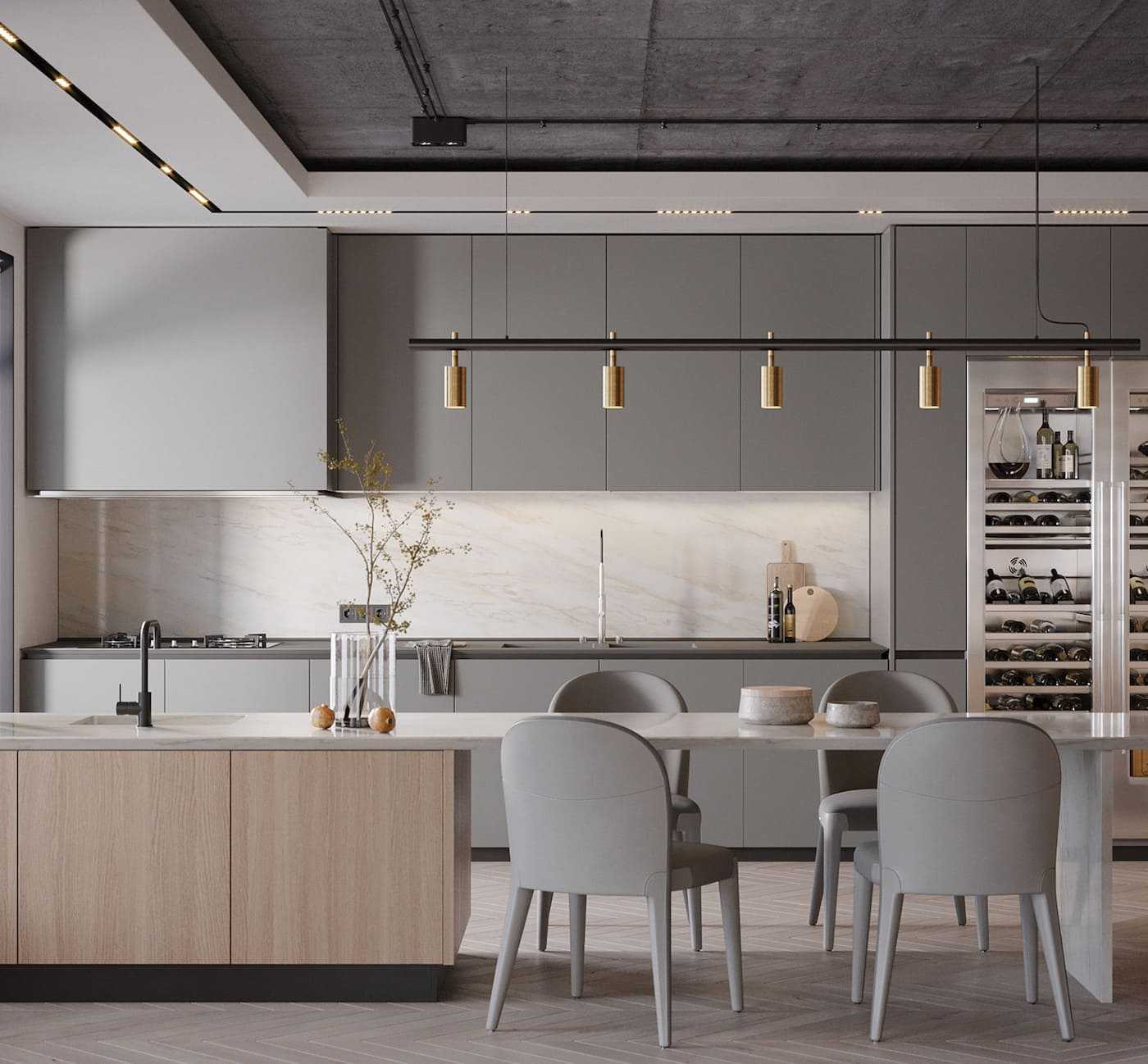 Оформляя современный интерьер кухни 2022 должно быть хорошо понятно, где основной тон, а где вспомогательный. Необходимо использовать несколько полутонов базового колера. Такой способ внесет интригующие нотки в монохромное кухонное убранство, добавит разнообразия в дизайн и зонирует комнату на отдельные участки в зависимости от их назначения.