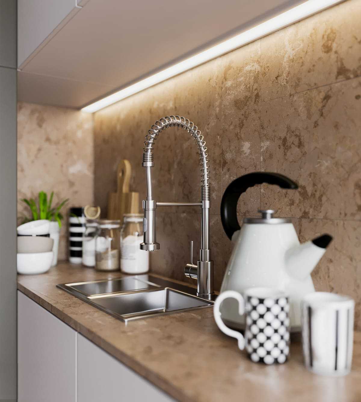 Правильно организованное освещение позволяет не только скрыть изъяны маленькой кухни, но и визуально расширить пространство. Для этого рекомендуется: