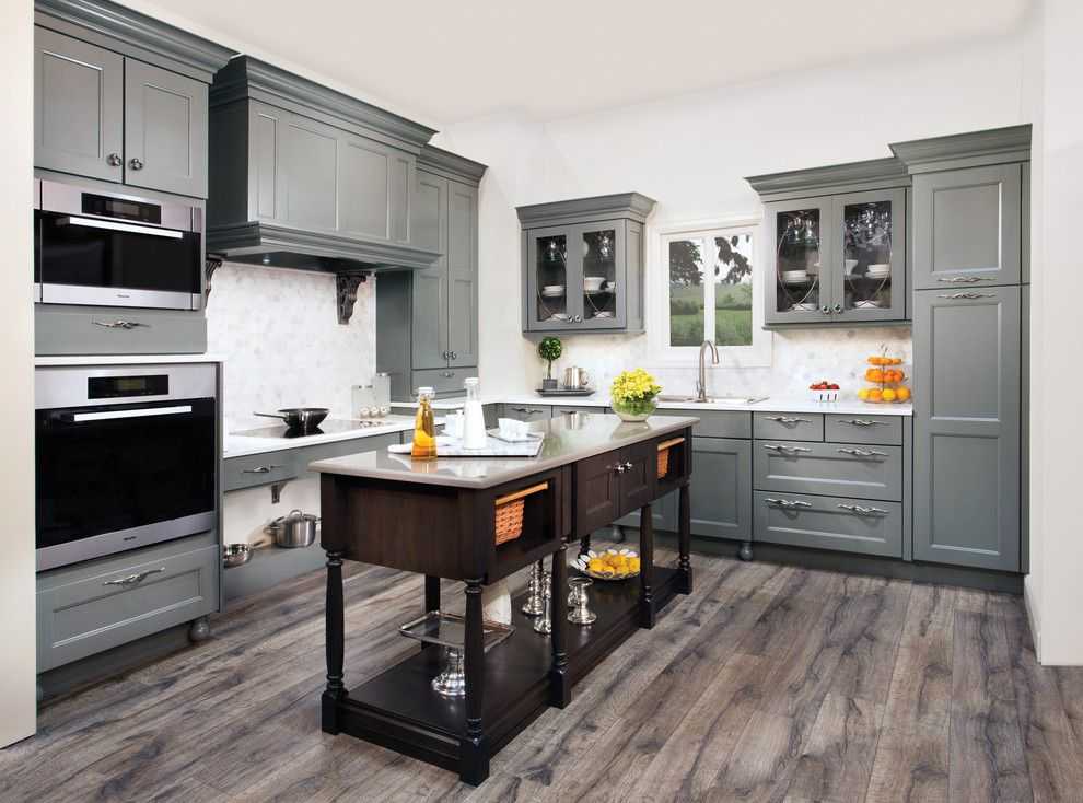 Насыщенные оттенки темного смотрятся благородно и солидно, тем более, если фасады будут иметь белый, кремовый или молочный цвет. Такие сочетания как нельзя лучше подойдут для классического стиля. Одинаковый тон фасадов и пола разграничит мебельный цоколь контрастного цвета. Он сможет элегантно «разорвать» единый цветовой монолит.