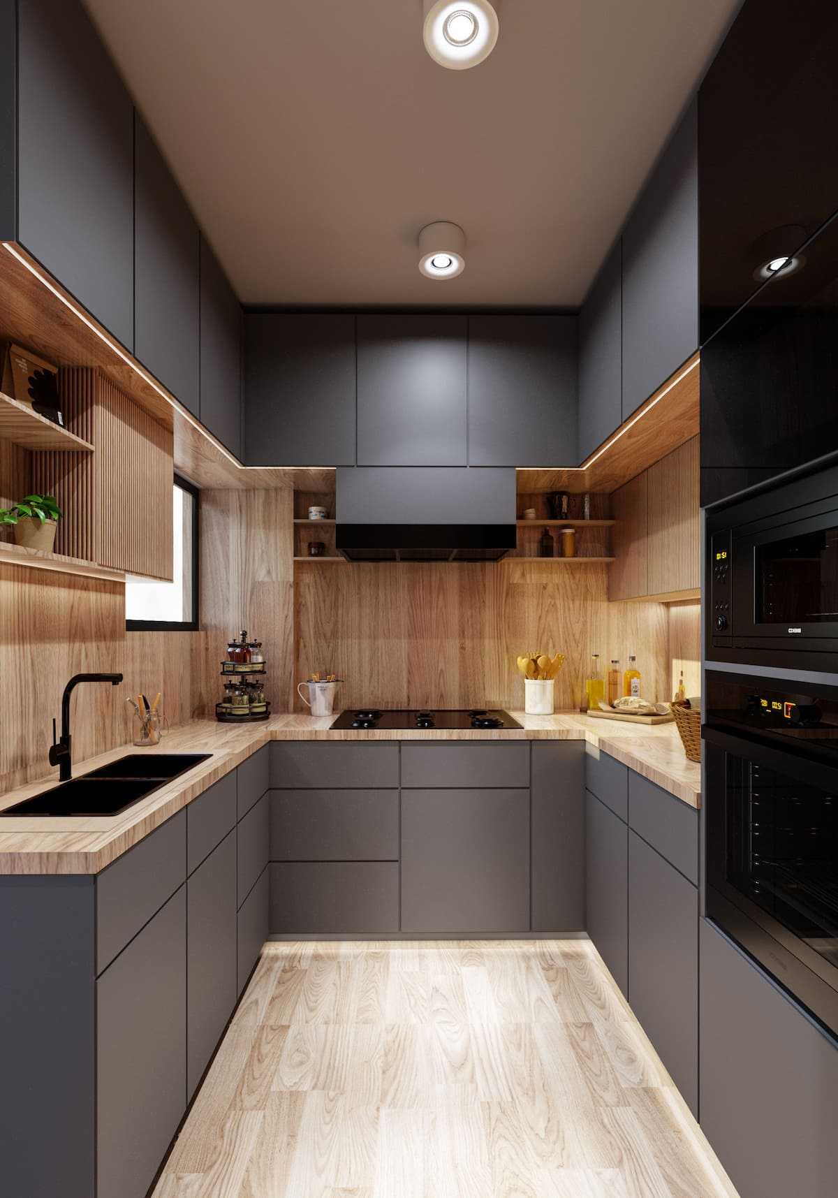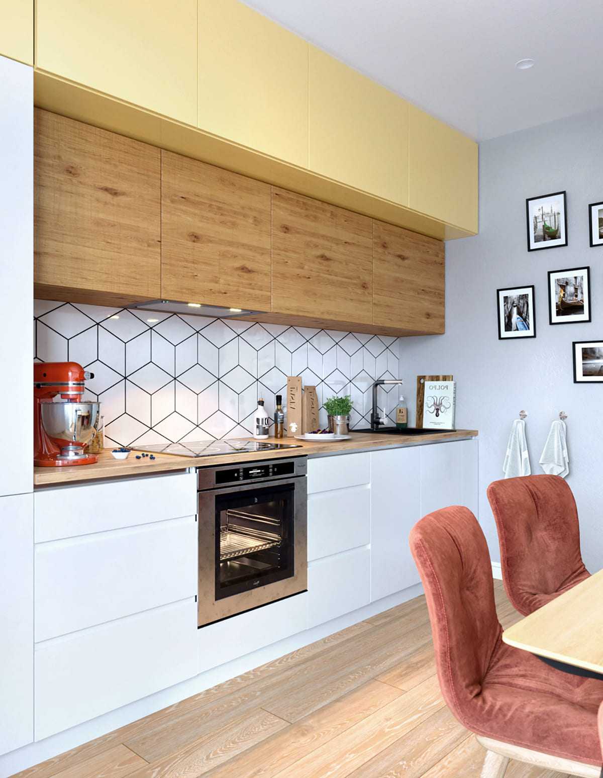 По-прежнему актуально дерево. Влагостойкая паркетная доска выглядит дорого в дизайне маленькой кухни 2021 и полностью отвечает тренду на экологичность.