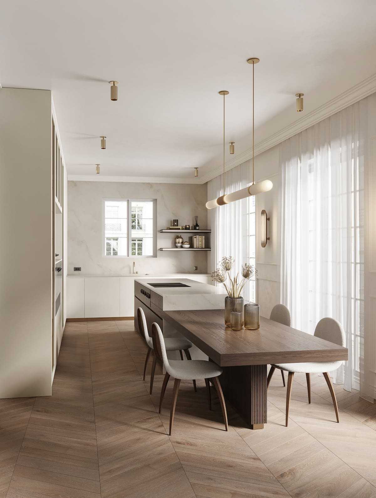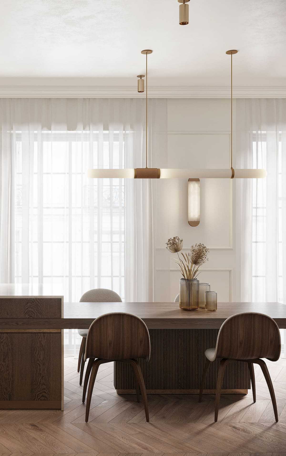 Таким образом можно даже зрительно увеличить пространство. Также очень часто чтобы дополнить такой интерьер, используют освещение над обеденным столом.