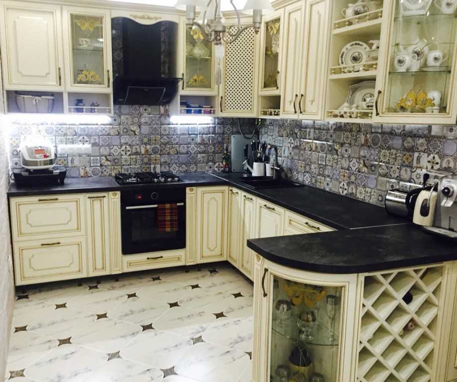 Ярко и очень стильно Кухня в стиле современная классика с темным фартуком