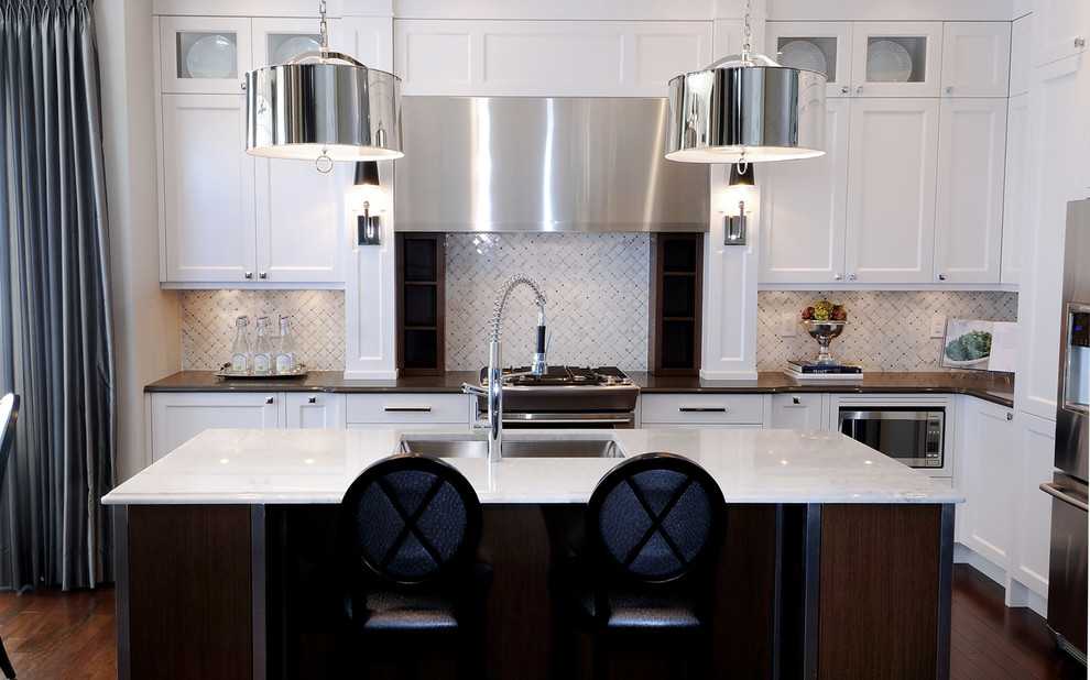 Элегантные цветовые акценты в светлой кухне на элементах кухонного гарнитура из темного венге