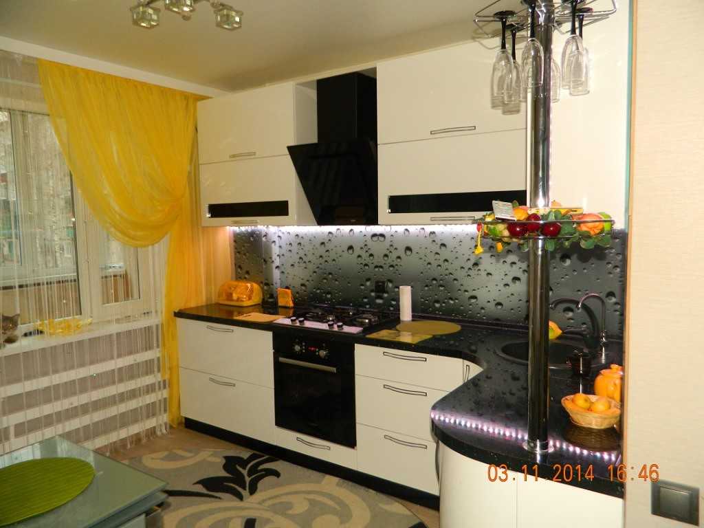 Подходит только для кухонь с большой площадью, где имеются большие окна. К тому же, доминировать должен светлый оттенок, к примеру, серый – 60 %. Можно сделать пол из черной плитки и или черно-белый фартук.