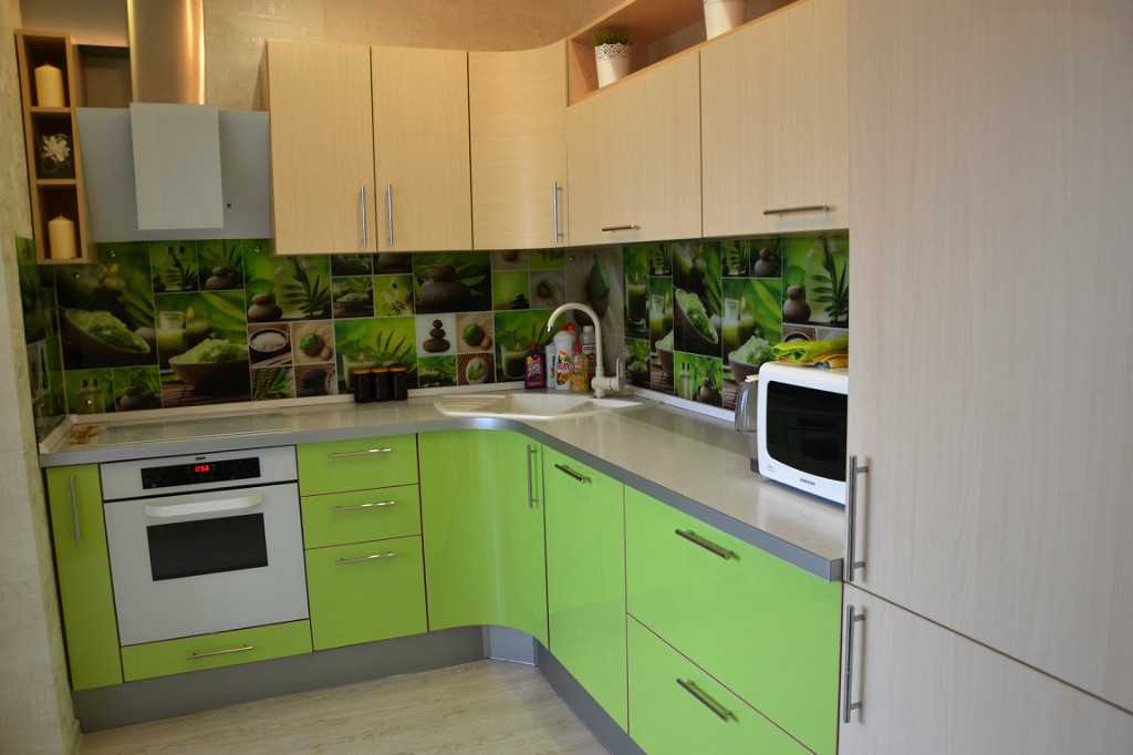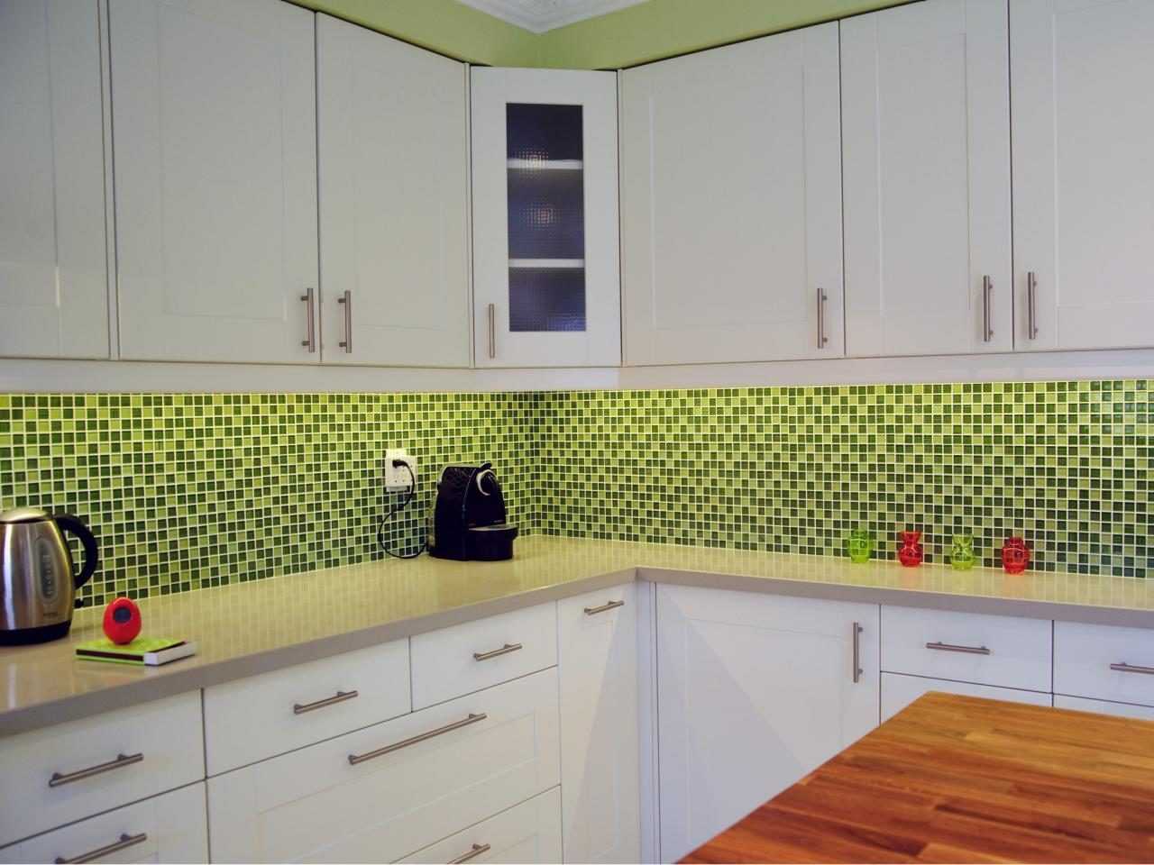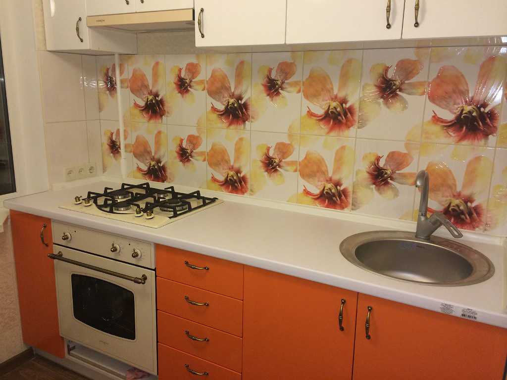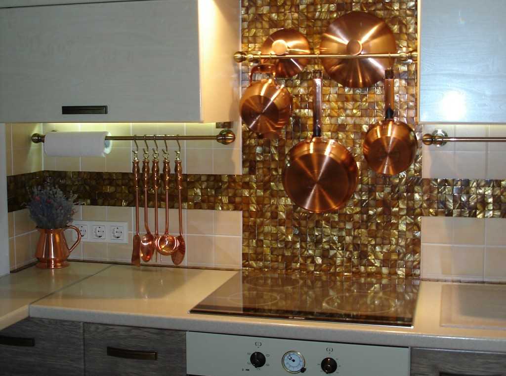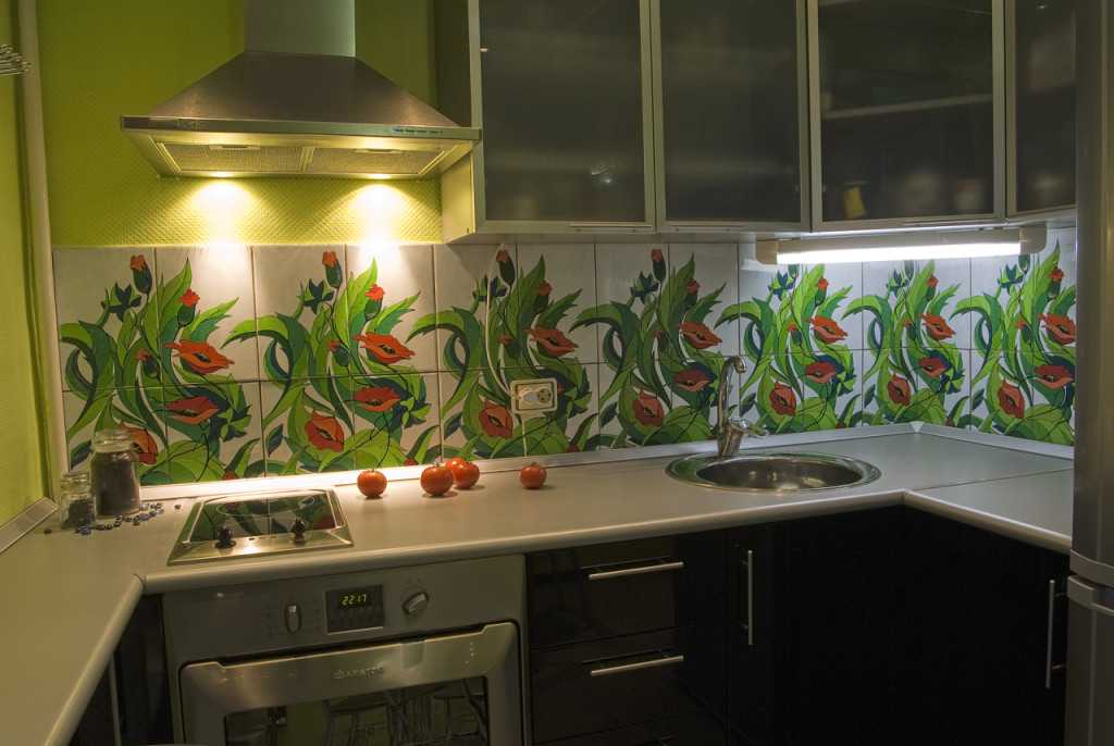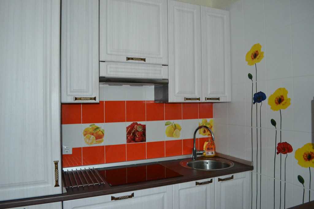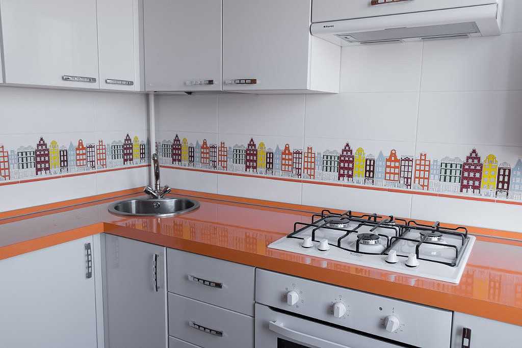 Материал отделки можно выбрать на свое усмотрение — керамическую плитку, цветную мозаику, декоративную штукатурку, деревянные и металлические панели. Еще одно интересное решение — установка фартука из закаленного стекла, на которое можно нанести яркий рисунок.