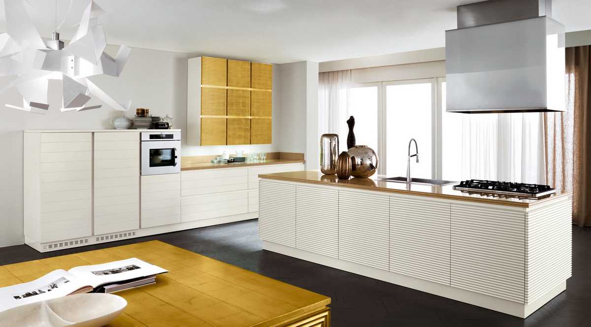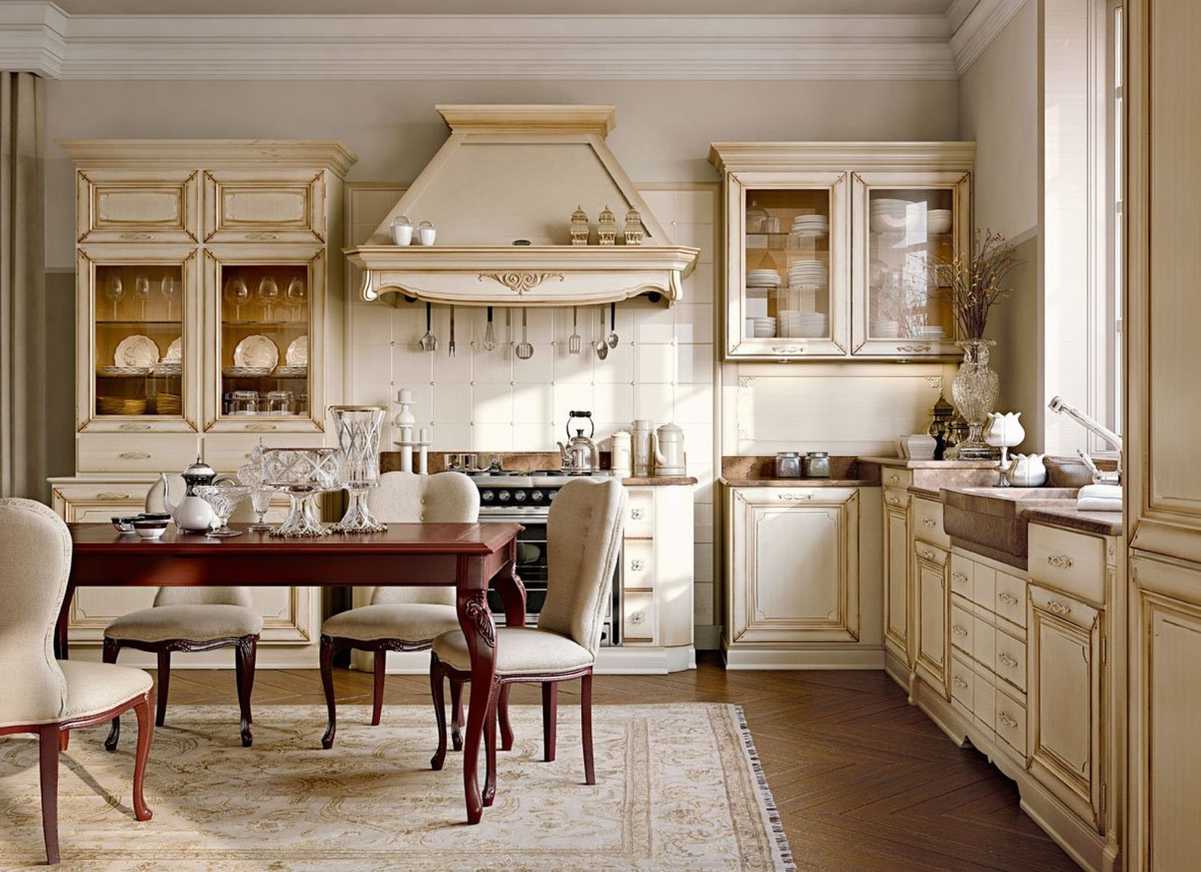 1. Классика. Благородный вид гарнитура с декором из натурального материала и наличие богатых аксессуаров – вот решение, которое можно воплотить в жизнь. Кухня должна быть просторной с высокими потолками. Претендовать на это оформление маленькая кухня сможет, если портьеры, стены, и даже фартук будут отличаться от светлого гарнитура на пару тонов.