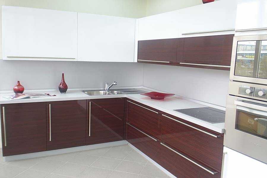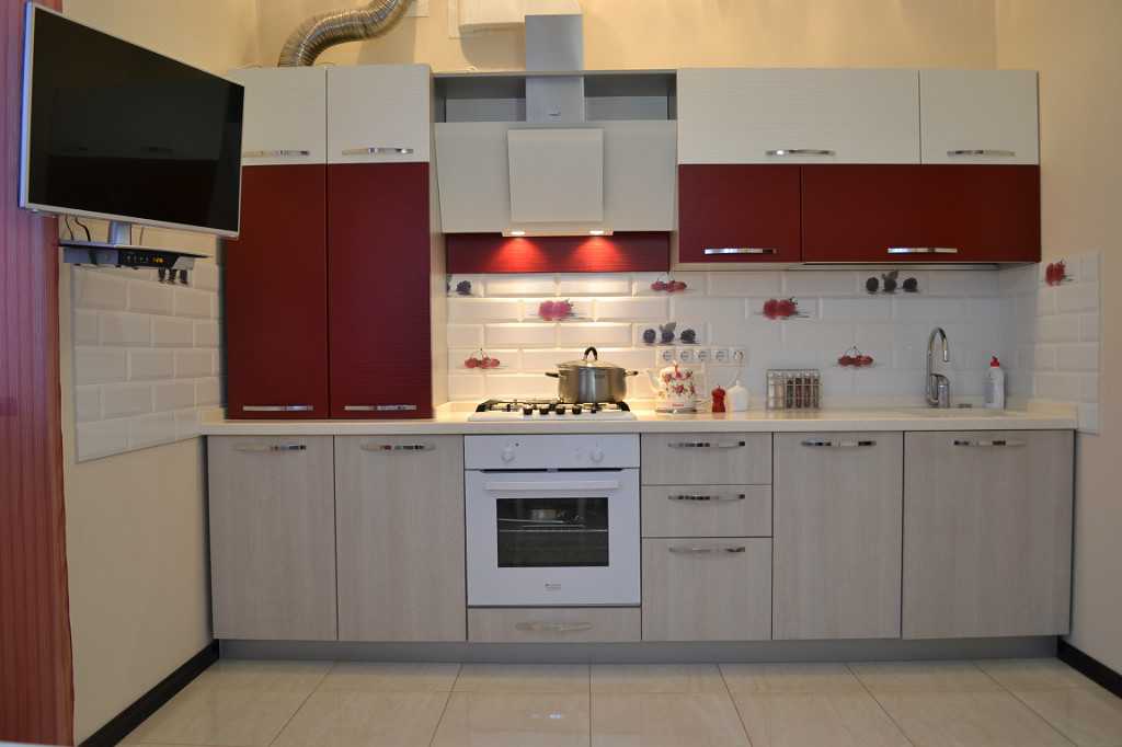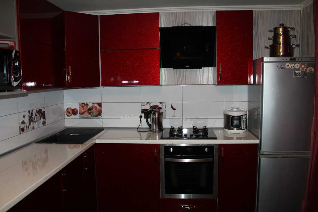 Отличным решением станет выполнение фасадов в бордовом цвете (нижних, верхних, или сразу всех). Дополнить изысканность этого предмета интерьера поможет хромированная металлическая фурнитура, а также стеклянные элементы (стекло может быть матовым или прозрачным). Что касается самого гарнитура, то в современных интерьерах неплохо будет выглядеть глянцевый блеск.