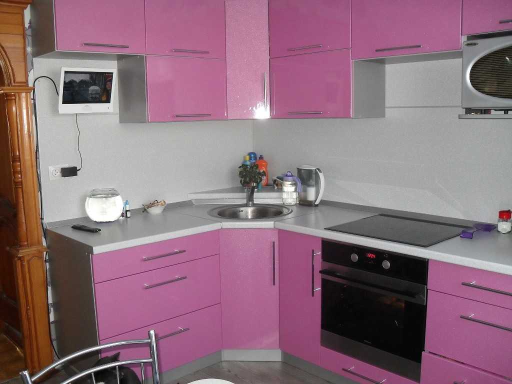 - Гармоничен серый с розовым и оттенками сиреневого. Сам пепельный также могут содержать подобные нотки, что сделает интерьер романтичным и довольно ажурным. Сиреневая палитра универсальна: глянец смотрится более холодно, как и металлик, а вот матовая сиреневая поверхность сделает кухню уютной.