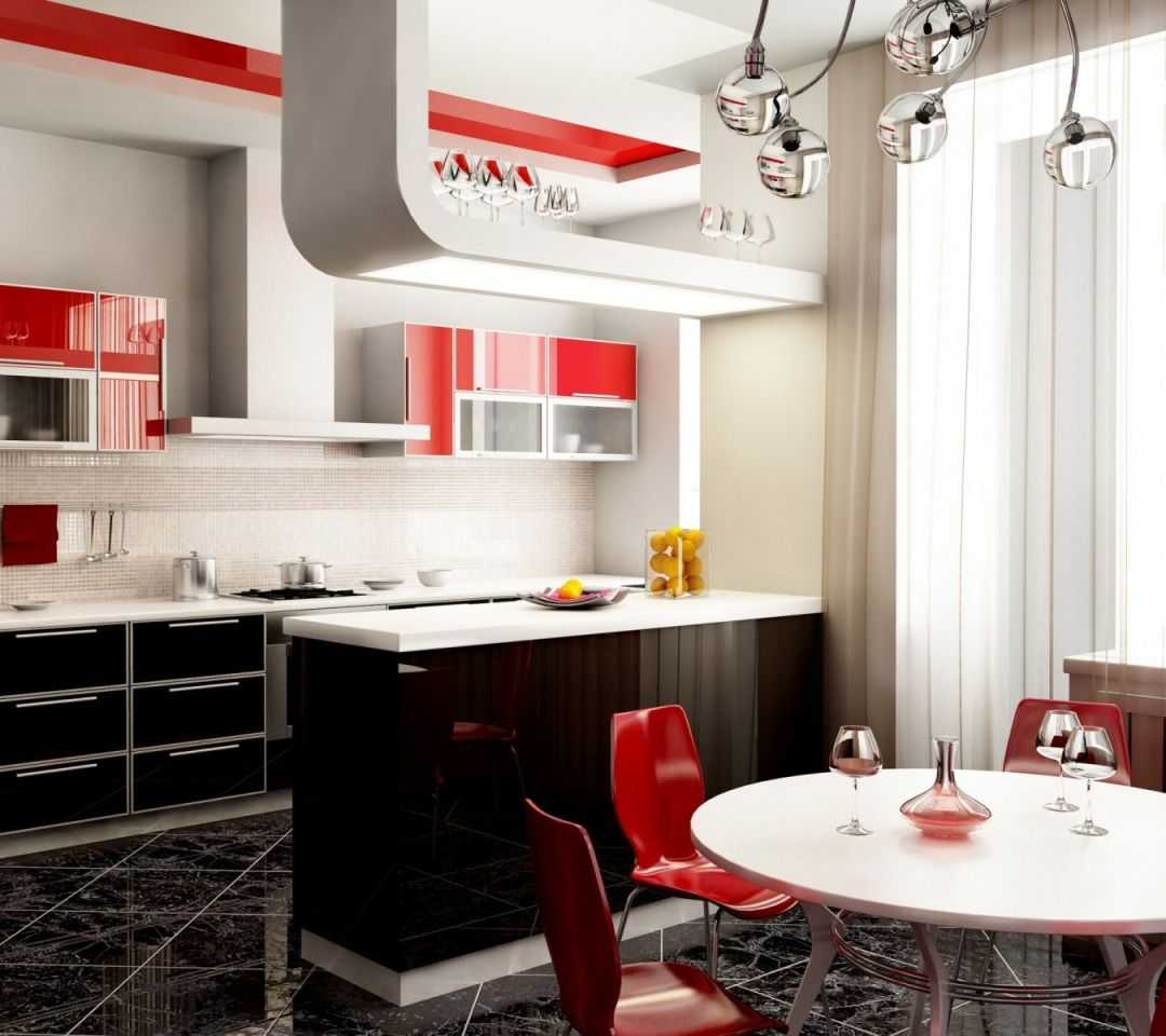 Кухня с гостиной после сноса большинства стен создает открытое пространство — подходящий фон для любимого оборудования и мебели. Красная кухня с гостиной — необычный интерьер. Обустройство комнат — это прежде всего игра цветов: красного, белого, черного. Она подчеркивает эффектные формы мебели для кухни и гостиной.
