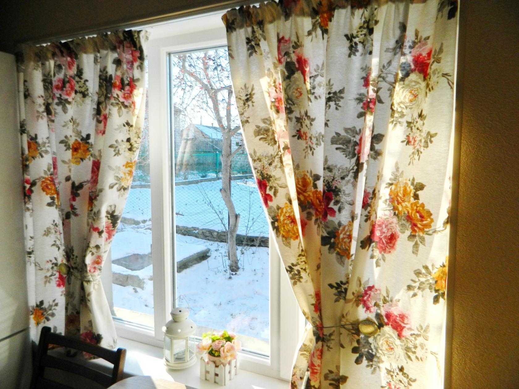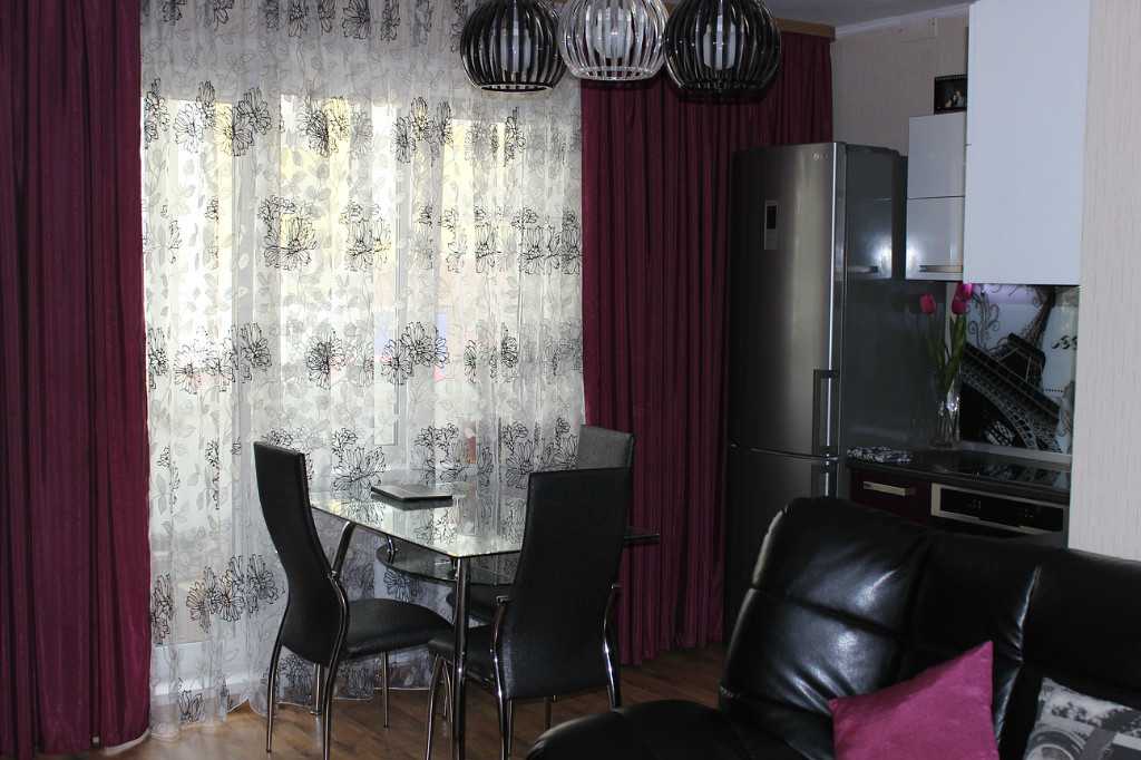 Для маленькой кухни подойдут легкие занавески бордового цвета, перевязанные атласной лентой (серой, белой или коричневой). При желании, к шторам можно подобрать изящную тюль — такой вариант будет отлично смотреться в кухне-гостиной.