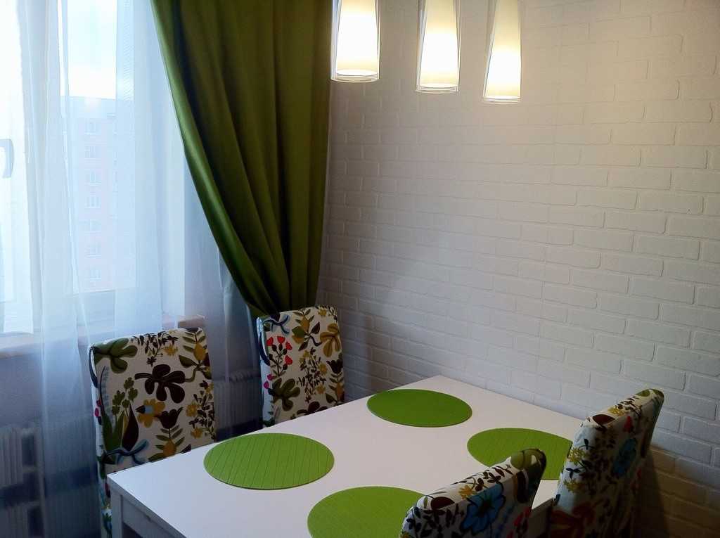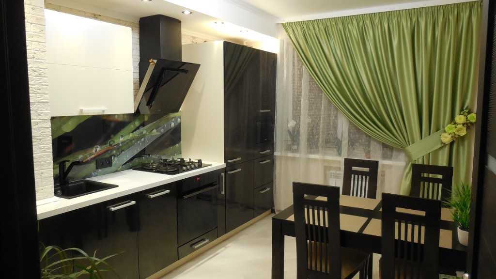 Современный дизайн может использовать дуэт серого и палитры в зеленых тонах. Это может быть и глянец, и металлик, и сочный травяной оттенок, и глубокий изумруд. Темно-зеленым может быть пол, поверхность каменной столешницы, частично фасады и даже плитка фартука. Такой цвет штор будет скорее уместен в ретро-направлениях. Тогда предпочтительна матовая отделка стен, мебели, кухонного гарнитура в том числе.