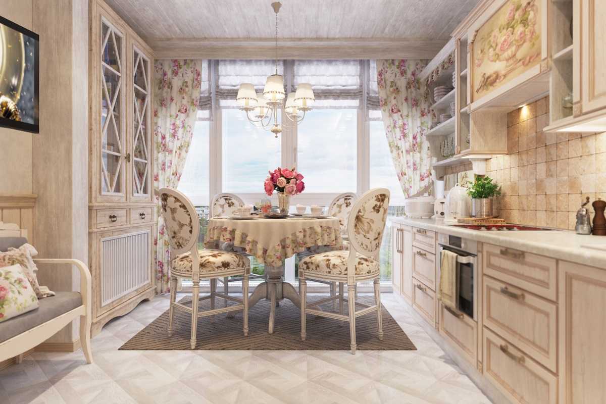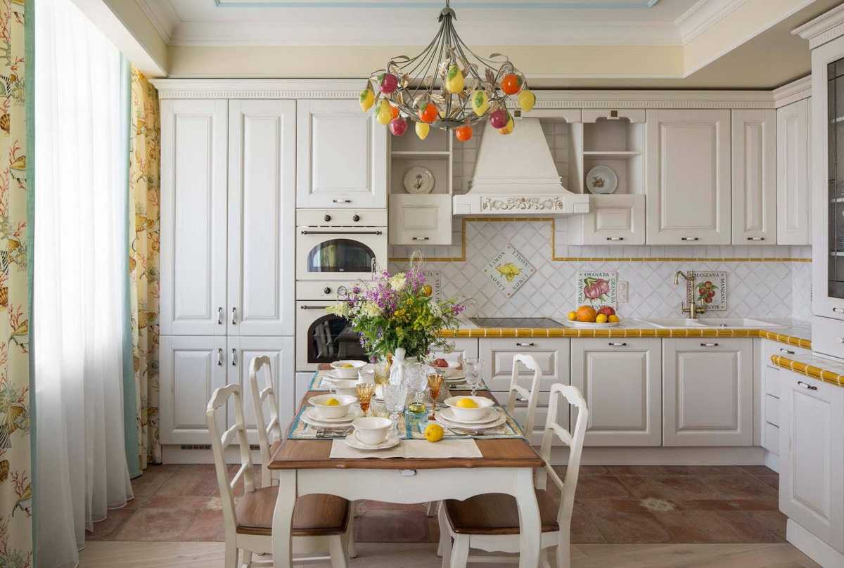 3. Прованс. Светлый гарнитур отлично сочетается с ситцевыми занавесками, обоями в мелкий цветок, растениями и выбранным текстилем. Яркий свет и легкость пленят каждого гостя на этой кухне.