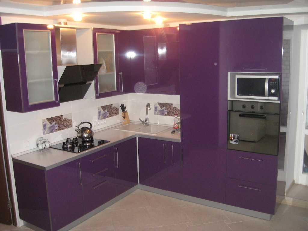 Выбирая мебель для небольшой и тесной кухни в фиолетовых тонах, следует учитывать ее реальную эргономичность. Рекомендуется подобрать высокий гарнитур из легких материалов с хорошей вместительностью и с глянцевыми поверхностями фасадов (нижние могут быть фиолетовыми).