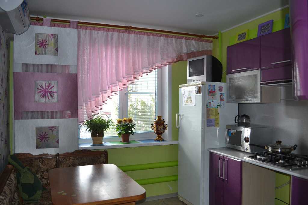 Хороший способ оформления такой кухни — выбрать вариант «фиолетовый низ» и «светлый верх». При этом пол можно сделать темным, а кухонный гарнитур и все предметы мебели — светлыми. Такая кухня будет выглядеть органично и стильно.