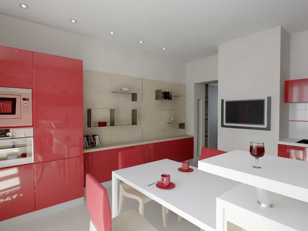 Кухня и гостиная обычно представляют одно целое после сноса межкомнатных стен. Расположение кухни — современное и энергичное. Самым важным здесь является игра цветов. Красная кухня доказывает, что хороший дизайн подойдет для любого интерьера.