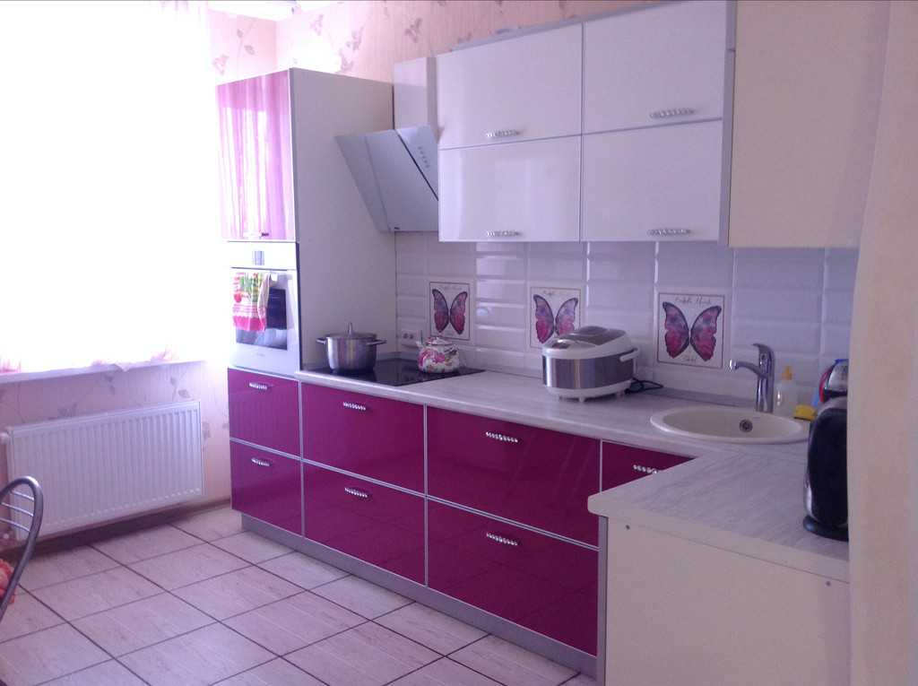 Можно установить на тесной кухоньке встроенную мебель, выполненную с фиолетовых тонах — она поможет максимально сэкономить пространство.