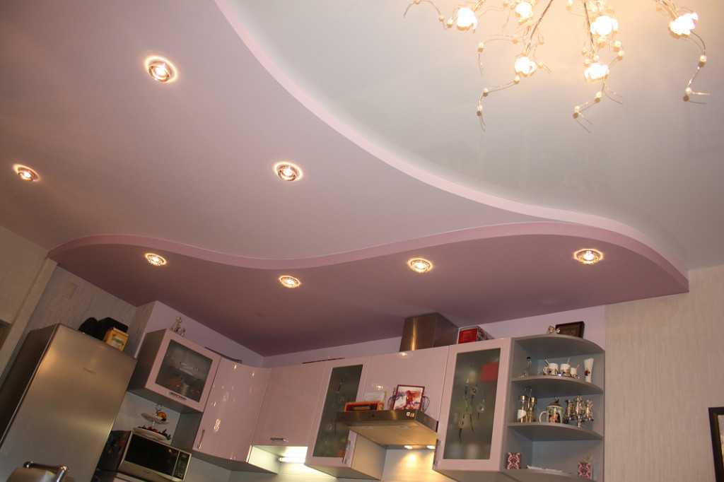 Ни в коем случае нельзя устанавливать в таком помещении фиолетовые натяжные потолки, которые создадут ощущение плотно закрытой коробки. Также не следует выбирать массивную подвесную люстру — лучшим решением станет небольшой потолочный светильник из стекла. Украсить кухню можно с помощью такой детали, как большие часы, цифры и стрелки которого монтированы прямо на стену.