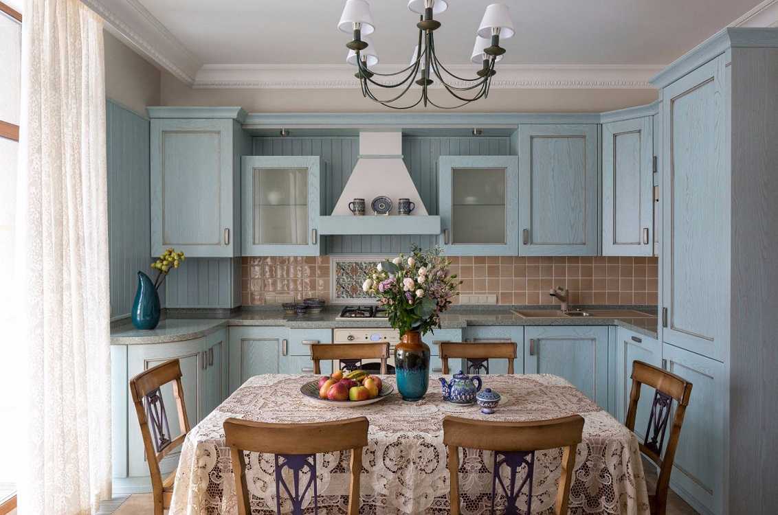 Стол и стулья могут быть как деревянными, так и плетеными или из ротанга. Основное требование – никаких современных конструкций. Мебель должна выглядеть чуть устаревшей. Хорошим решением будет применение текстильных чехлов нужной расцветки. Допускается использование разномастных стульев – такой ход создает очень непринужденную обстановку на кухне. Также дизайнеры рекомендуют приобретать мебель в стиле садовой – скамейки и столы с крестообразными ножками.