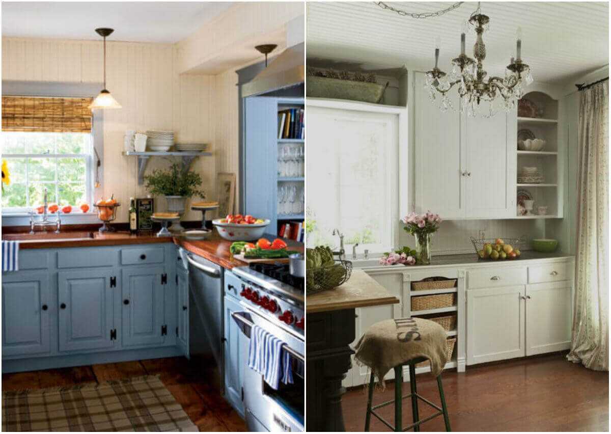 Ремонт в стиле кантри или прованс отличается цветом: в первом случае кирпич или камень должны быть естественного цвета, во втором – фартук будет побеленным или оштукатуренным. Рейлинг, кстати, нежелателен – кованые крючки или крючки из латуни подойдут больше.