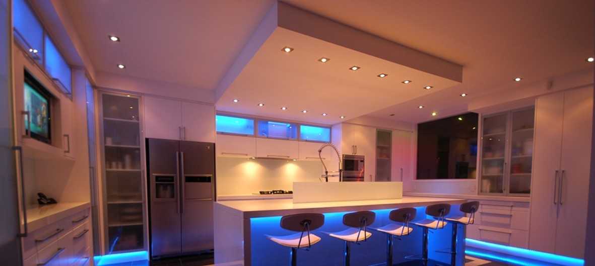 Хорошую роль сыграют светодиодные ленты или скрытая подсветка. Первые проложите под верхними шкафчиками кухонного гарнитура. Так они визуально приподнимутся и кухня будет казаться выше, чем на самом деле.